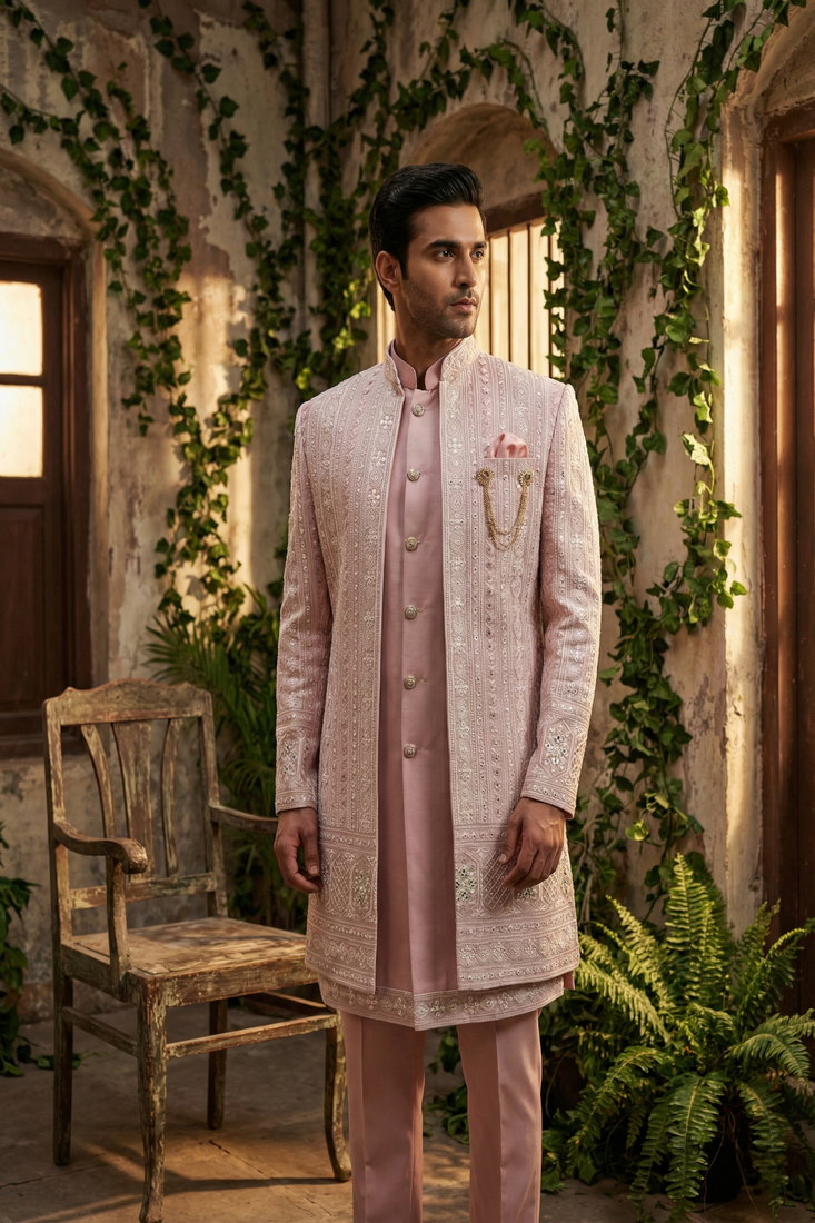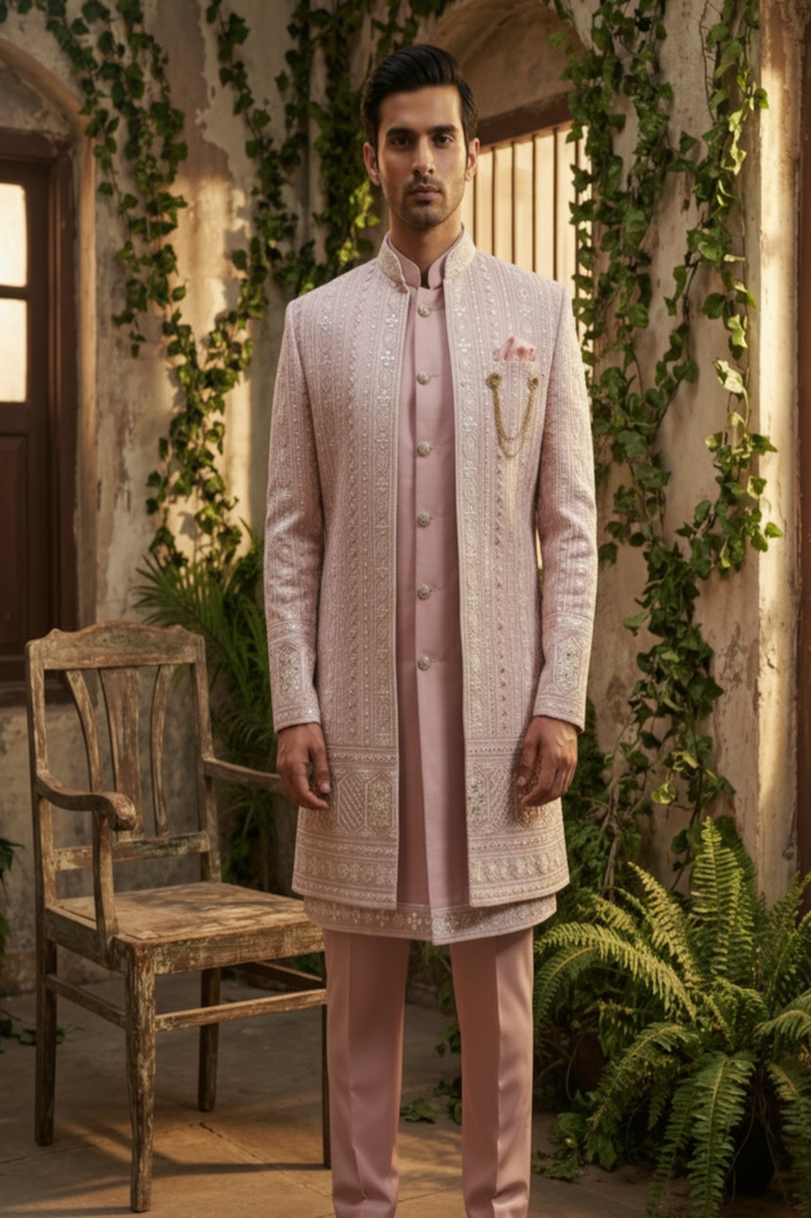 Pink thread and sequins embroidered indowestern