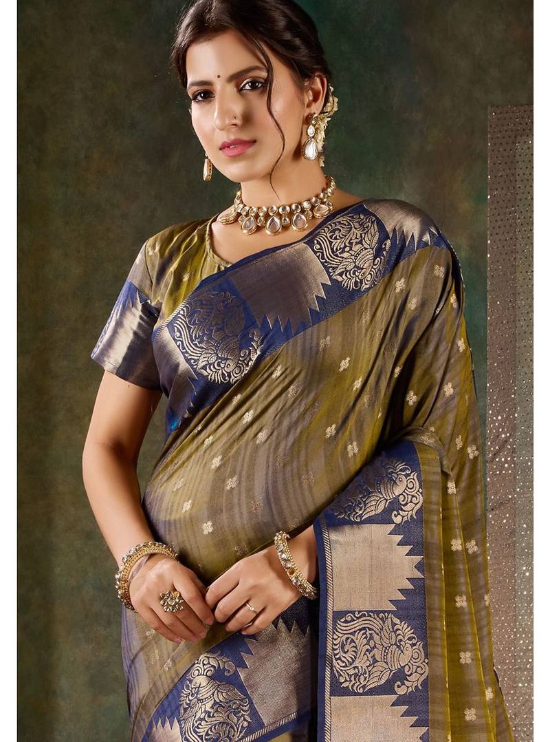 | Product Description | Command Attention In This Sophisticated Deep Bronze And Navy Blue Banarasi Silk Saree. The Body Of The Saree Features A Unique Metallic Bronze Gold Tone With A Textured Finish And Delicate Silver Butti Work. It Is Contrasted By A Majestic Navy Blue Border And Pallu, Richly Decorated With Traditional Peacock Motifs And Serrated Zari Patterns. This Elegant Drape Is Perfect For Evening Formal Wear, Weddings, Or High End Celebrations Where A Balance Of Tradition And Luxury Is Desired. Comes With Matching Unstitched Blouse. |