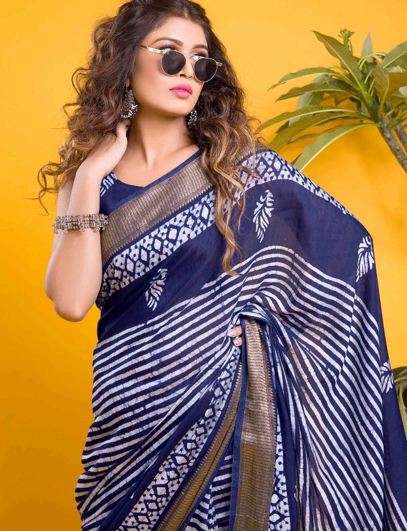 Navy blue linear stripe print saree