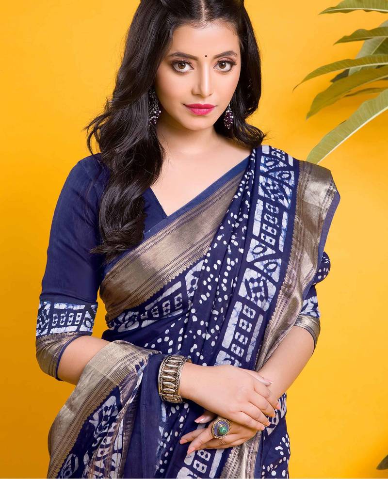 | Product Description | This Saree Is Covered In Intricate White "Dots" Characteristic Of Traditional Rajasthani And Gujarati Craft, Set Against A Regal Navy Blue Background. The Elegant Floral Motif Pallu And The Thick Antique Gold Zari Border Add A Layer Of Luxury, Making This A Go To Choice For Weddings, Poojas, And Festive Celebrations |
