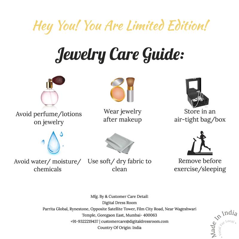 Care • Store In An Air Tight Bag/ Box • Use Soft/ Dry Fabric To Clean • Avoid Perfume/Lotions On Jewelry • Avoid Water/ Moisture/ Chemicals • Wear Jewelry After Makeup • Remove Before Exercise/Sleeping