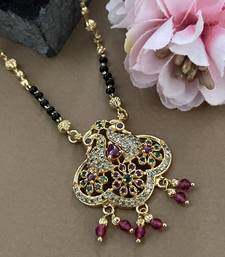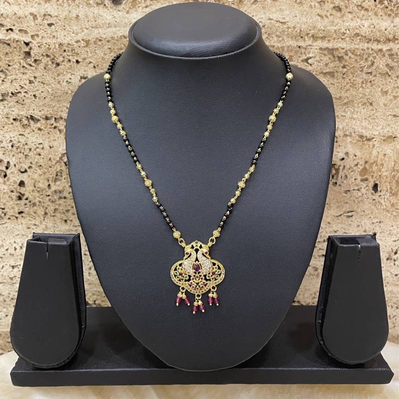 Gold plated fancy short mangalsutra ad & multi stone peacock pendant gold & black beads chain