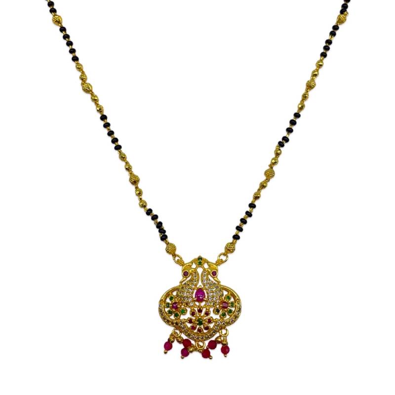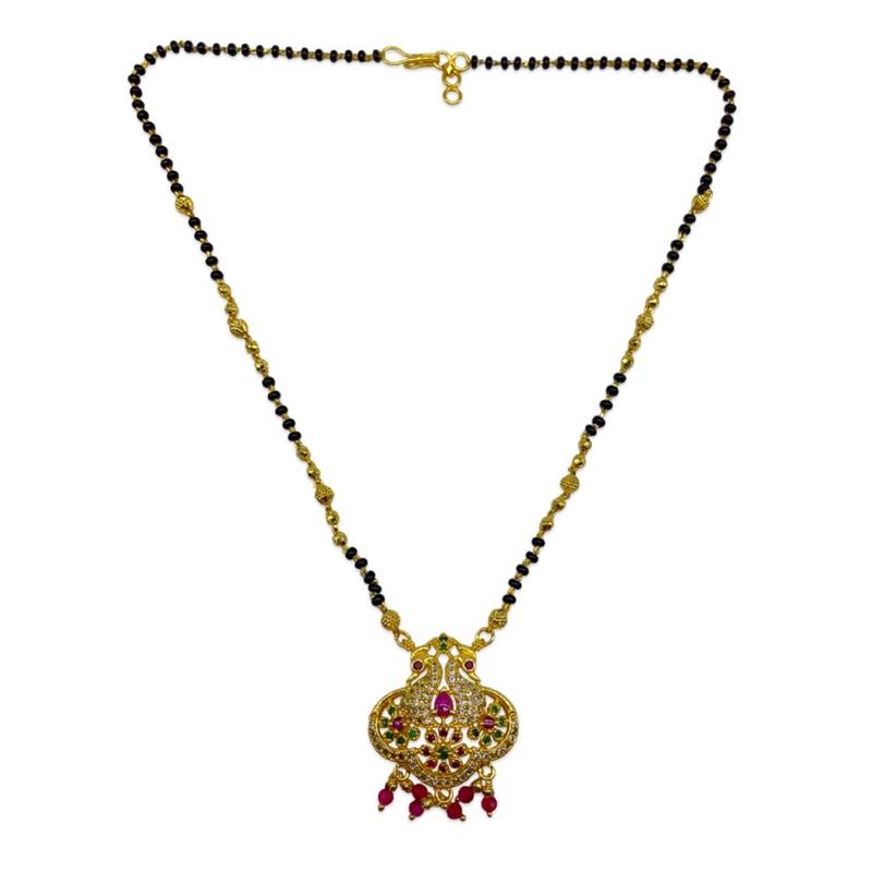 Gold Plated Fancy Short Mangalsutra Ad & Multi Stone Peacock Pendant Gold & Black Beads Chain