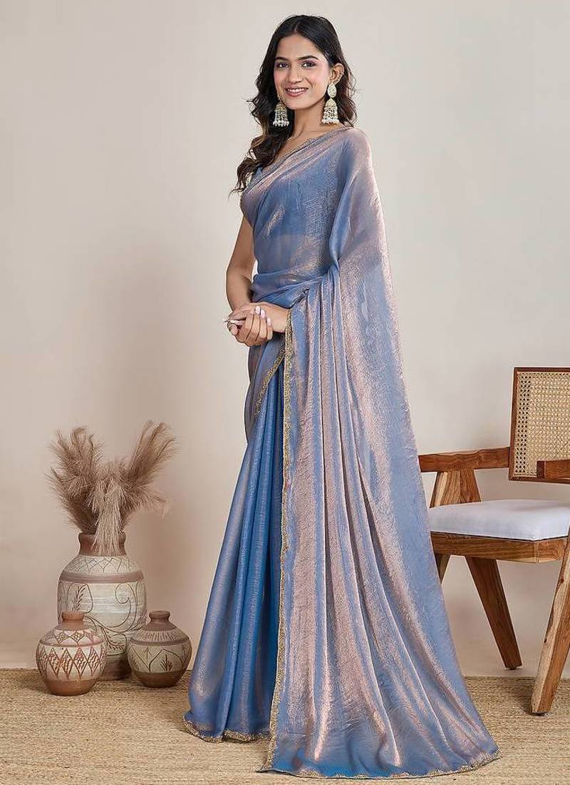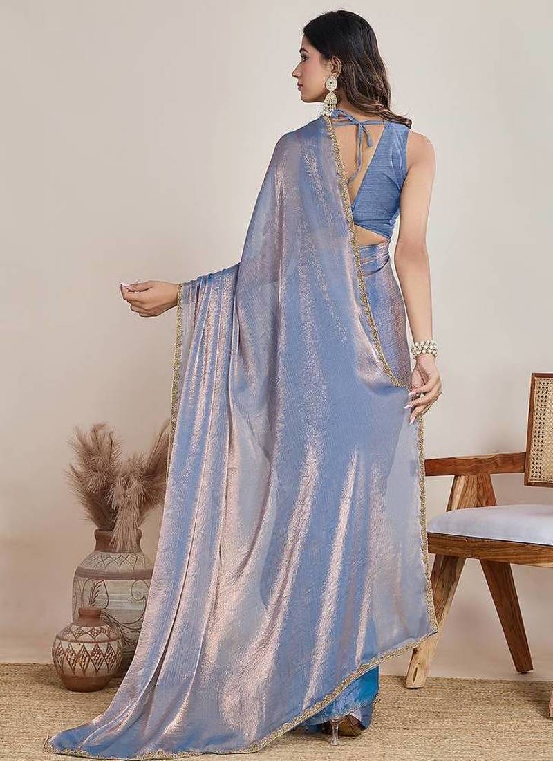 Light blue color fendy chiffon saree with running blouse