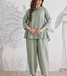 | Product Description | Stay Effortlessly Stylish And Comfortable With This Sage Green Co Ord Set, Crafted In Breathable Cotton Slub Fabric. The Kurta Features A High Low Hemline With A Relaxed Fit And Wooden Button Detailing At The Neckline, Paired With Matching Straight Fit Pants. Ideal For Casual Outings, Travel, Or Everyday Wear.