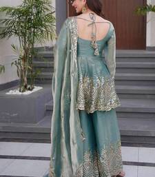 Teal fendy satin silk embroidery work party wear salwar suit stitched
