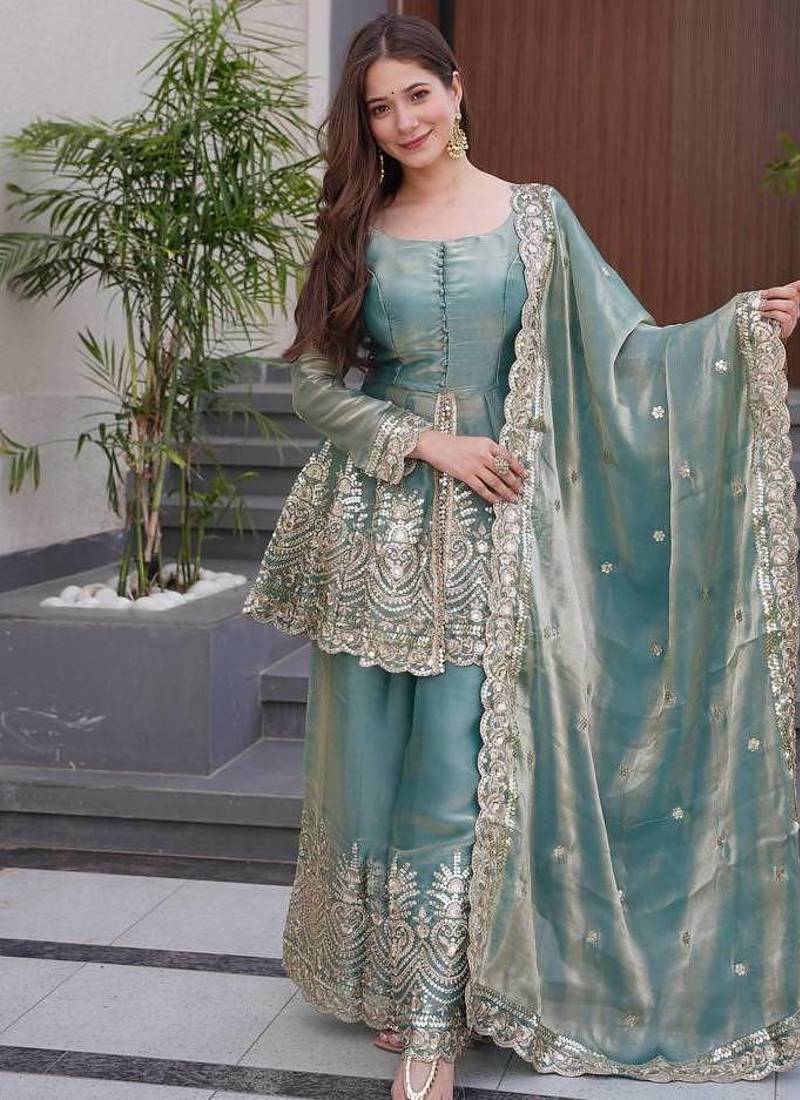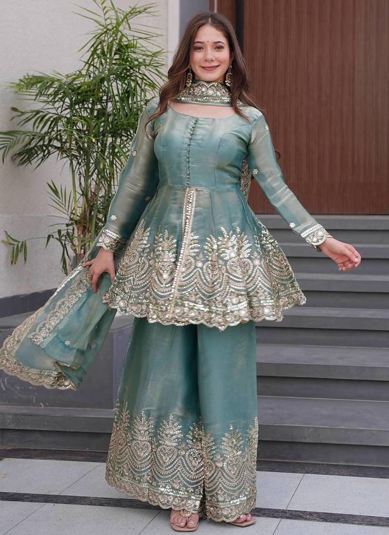 | Product Description | Elegant Heavy Two Tone Fendy Satin Silk Sharara Set Featuring Sequins, Real Mirror, And Heavy Embroidery Work With Stitched Top, Free Size Sharara, And Matching Embroidered Dupatta. |