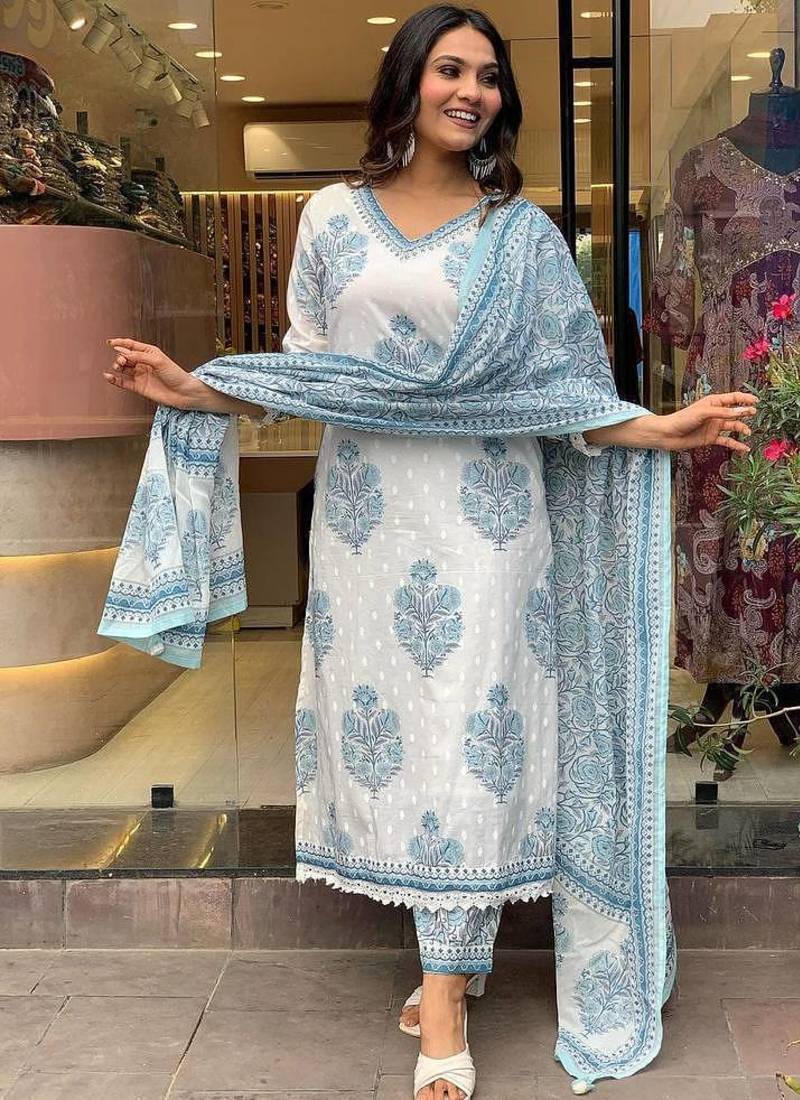 | Product Name | White Grey Cotton Hand Block Sanganeri Printed Straight Salwar Kameez Suit With Afghani Pant | |