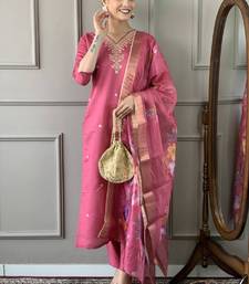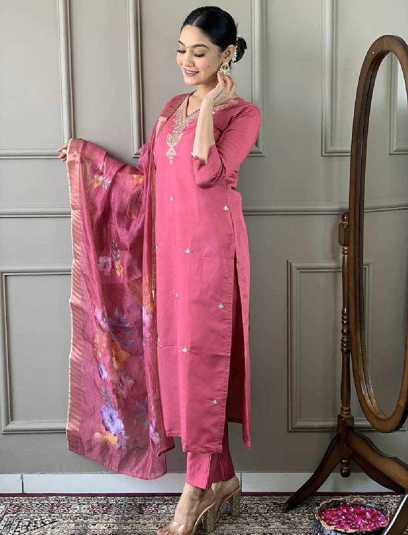 Women's chanderi viscose embroidered straight kurta with pant and printed dupatta set