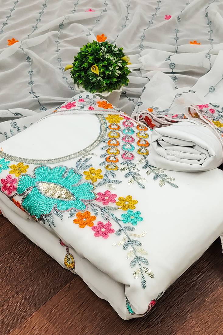 women white georgette sequin & floral pattern multicolor thread work kurta bottom dupatta set dress material unstitched