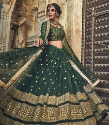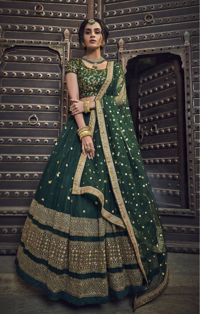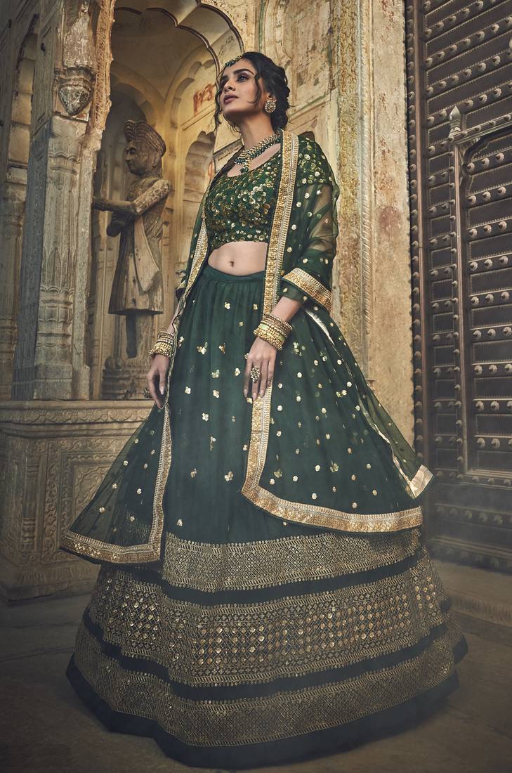 Green sequins and zari embroidered soft net festive & party wear semi stitched bridal lehenga