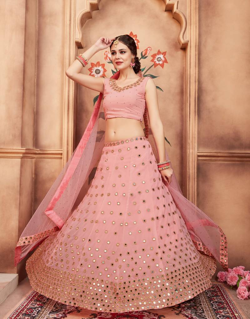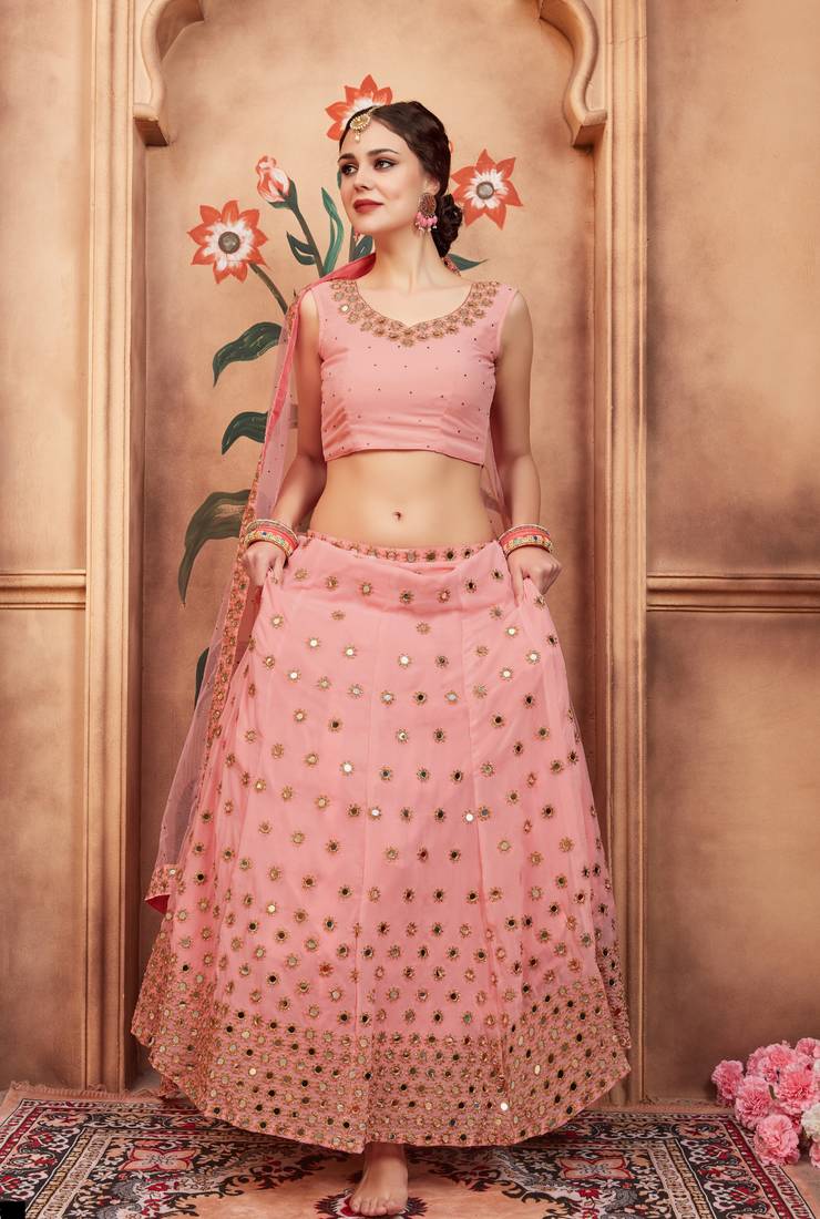 Peach zari and sequins embroidered georgette festive bridal wedding & party wear semi stitched lehenga choli