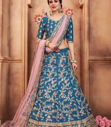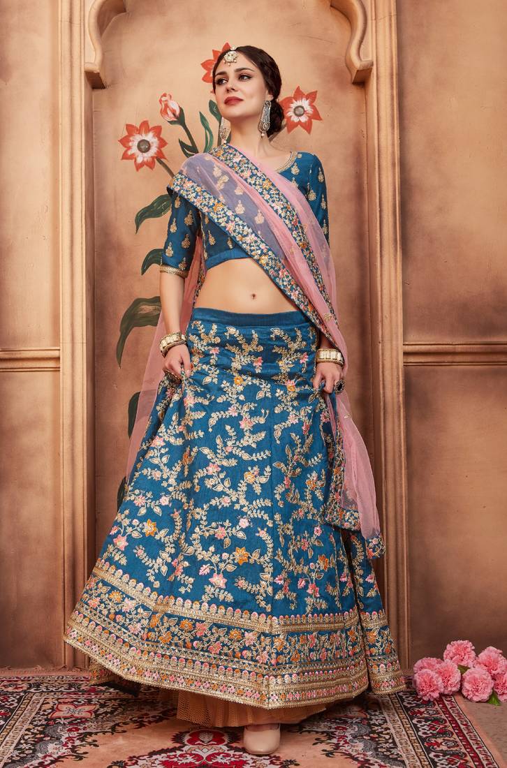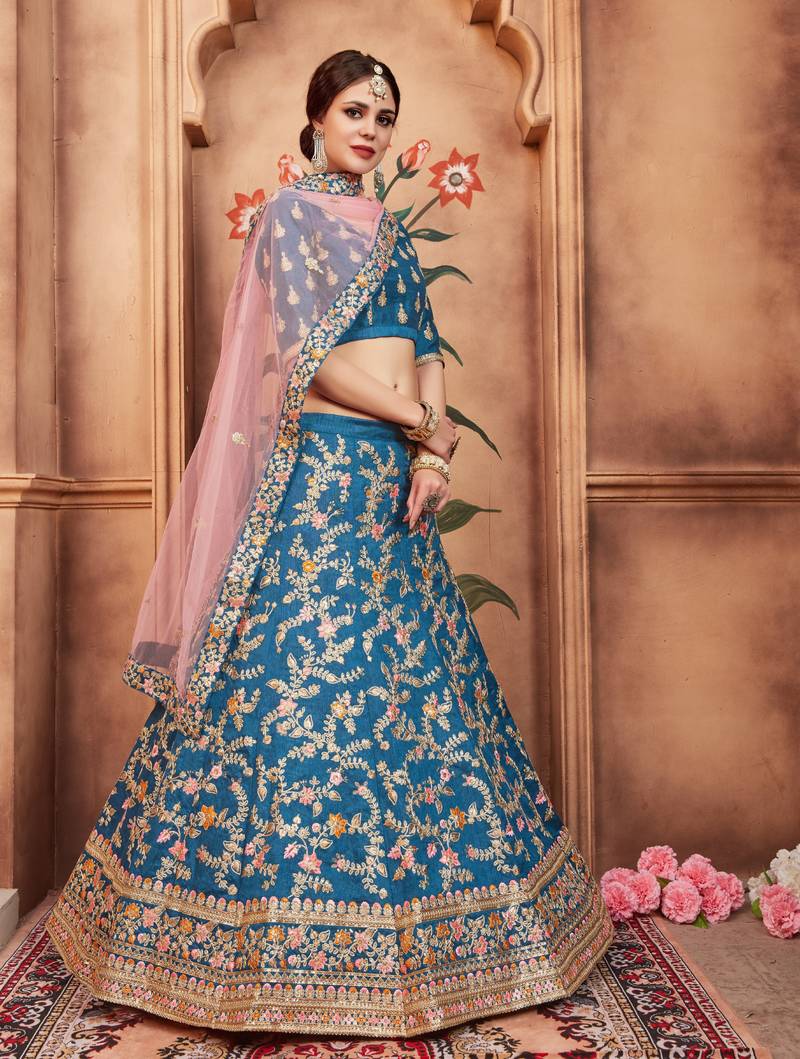 Turquoise thread and sequins embroidered art silk festive bridal wedding & party wear semi stitched lehenga choli