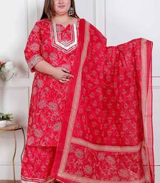 plus size red floral print embroidered cotton straight kurta with palazzo & dupatta stitched