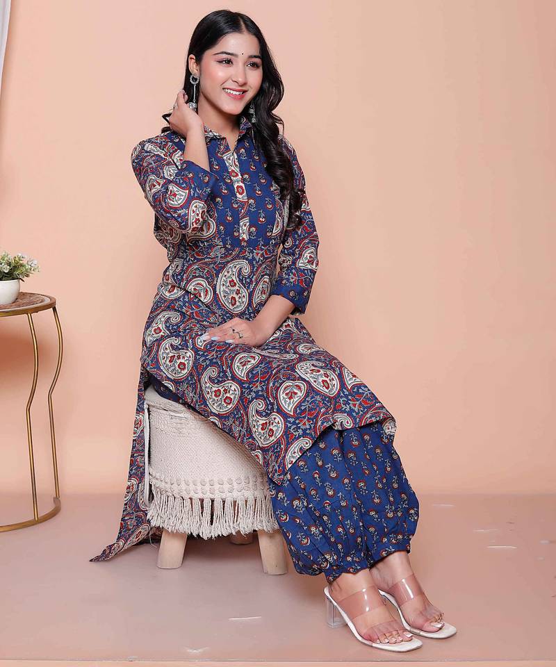 womens cotton floral printed shirt-collar straight kurta and palazzo set stitched