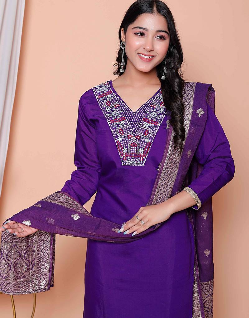 | Product Name | Womens Purple Muslin Stright Kurta And Palazzo With Dupatta Suit Set | |