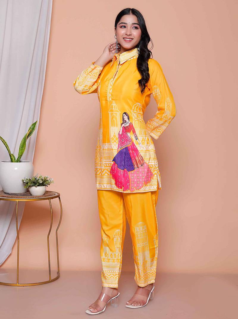 womens yellow digital printed kurta set stitched