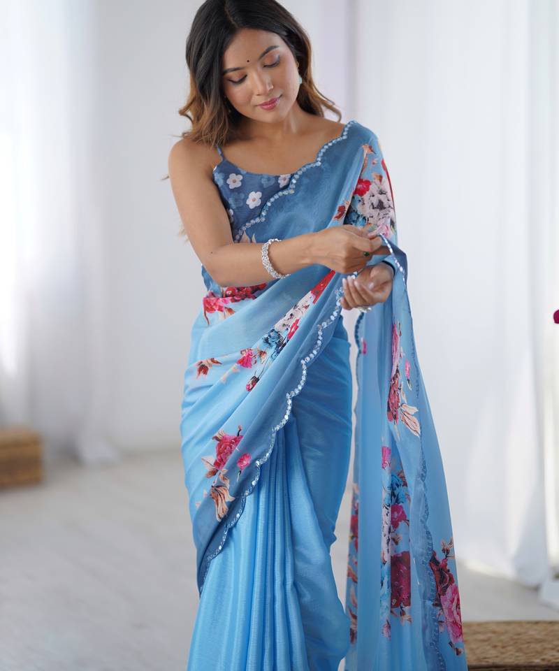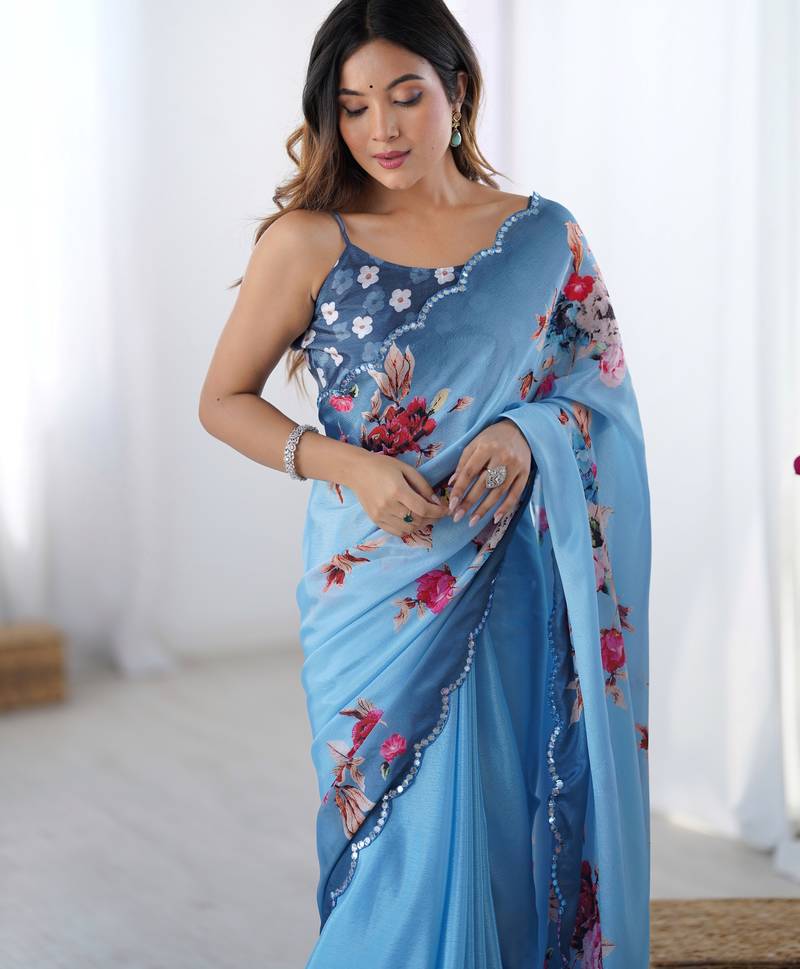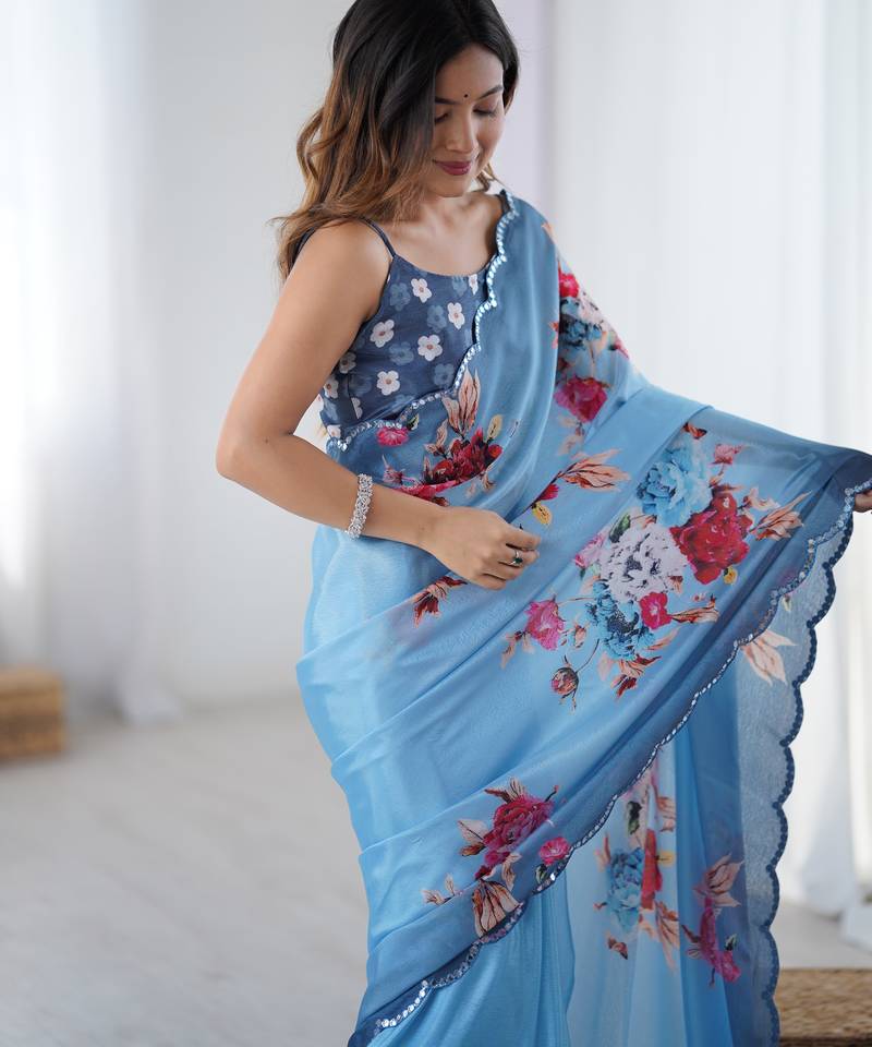 | Product Name | Chiffon Digital Print Scallped Border Foil Mirror Work Saree | |