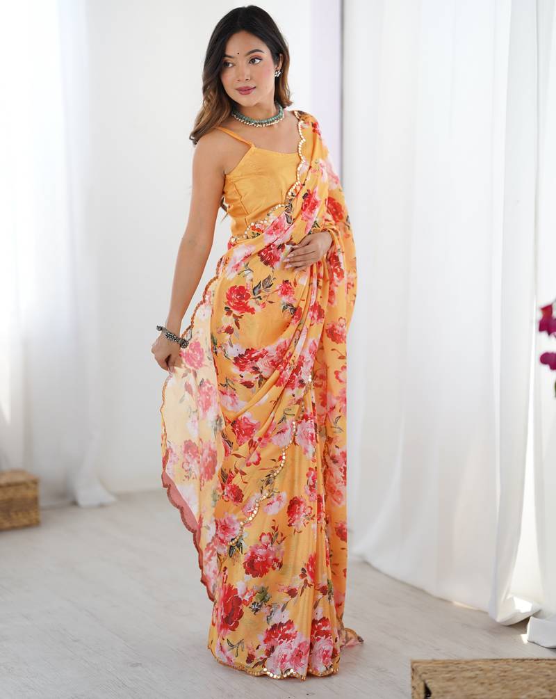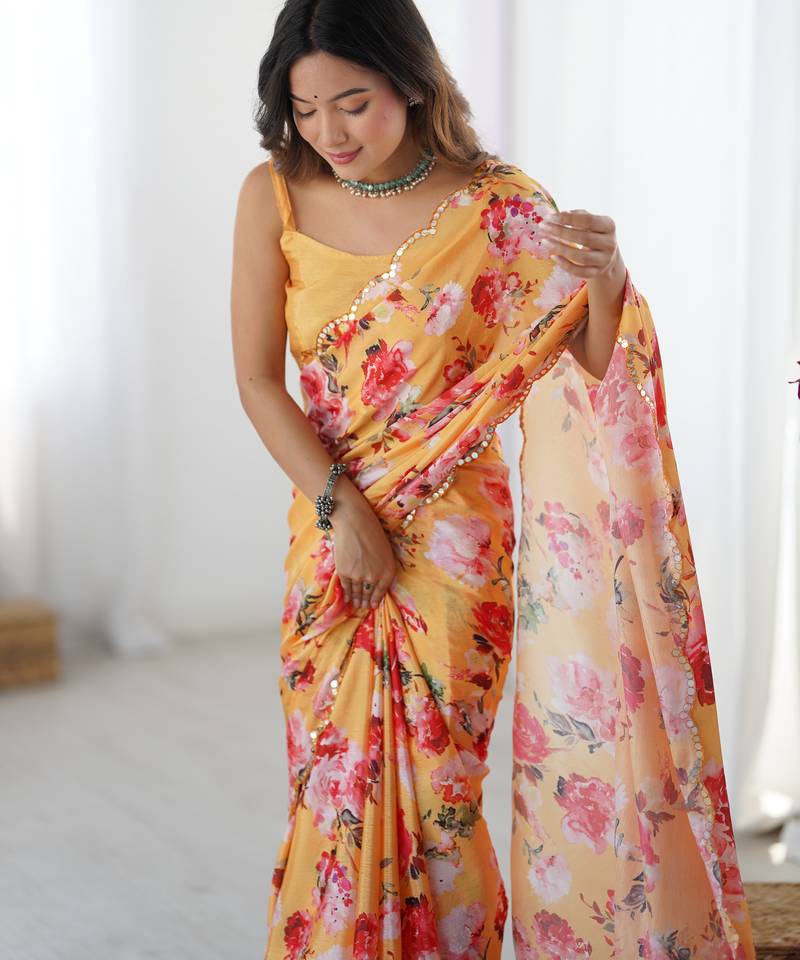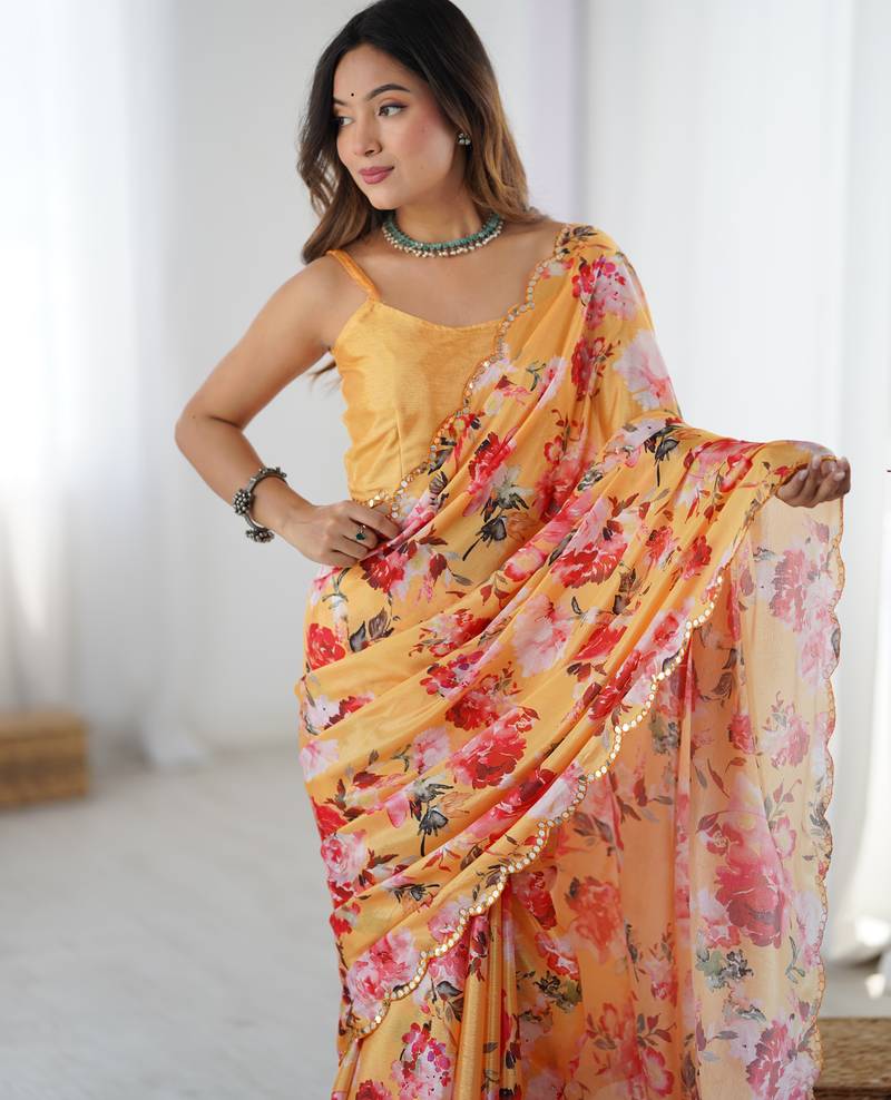 | Product Name | Chiffon Digital Print Scallped Border Foil Mirror Work Saree | |