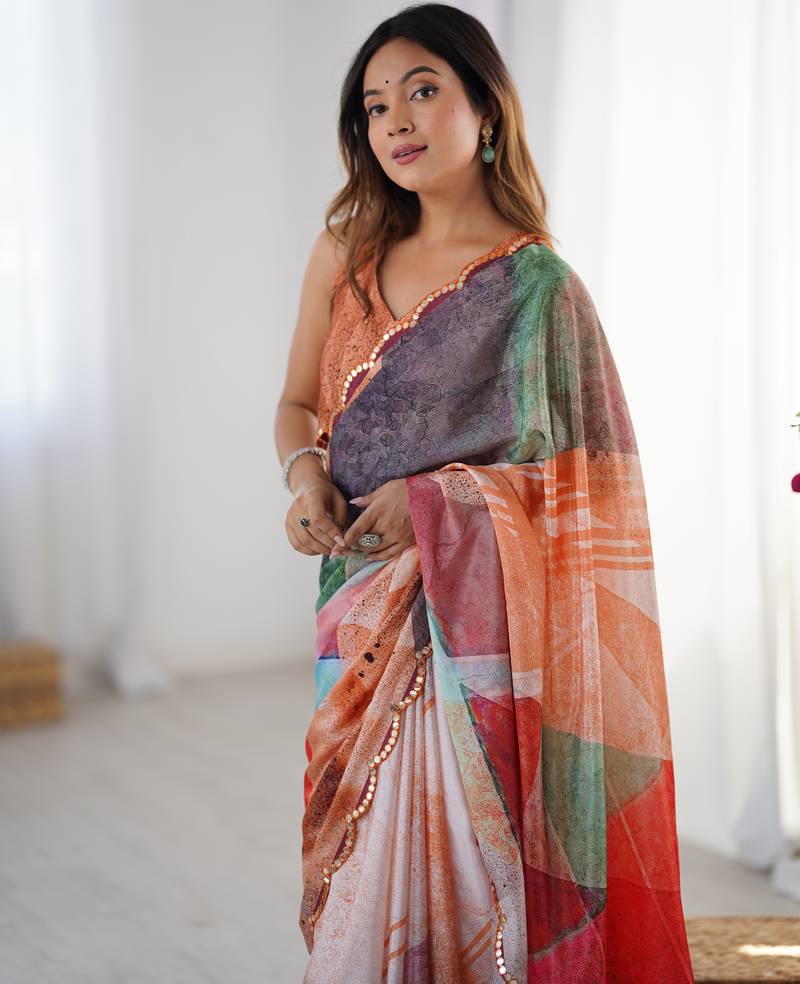 | Product Name | Chiffon Digital Print Scallped Border Foil Mirror Work Saree | |