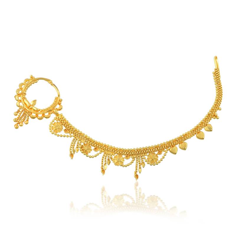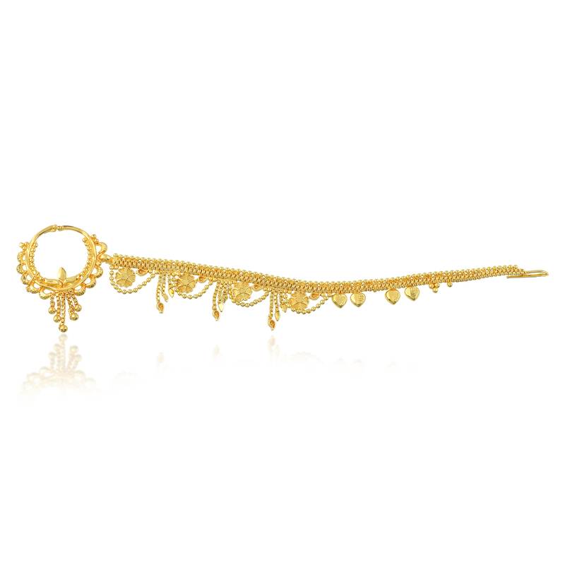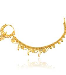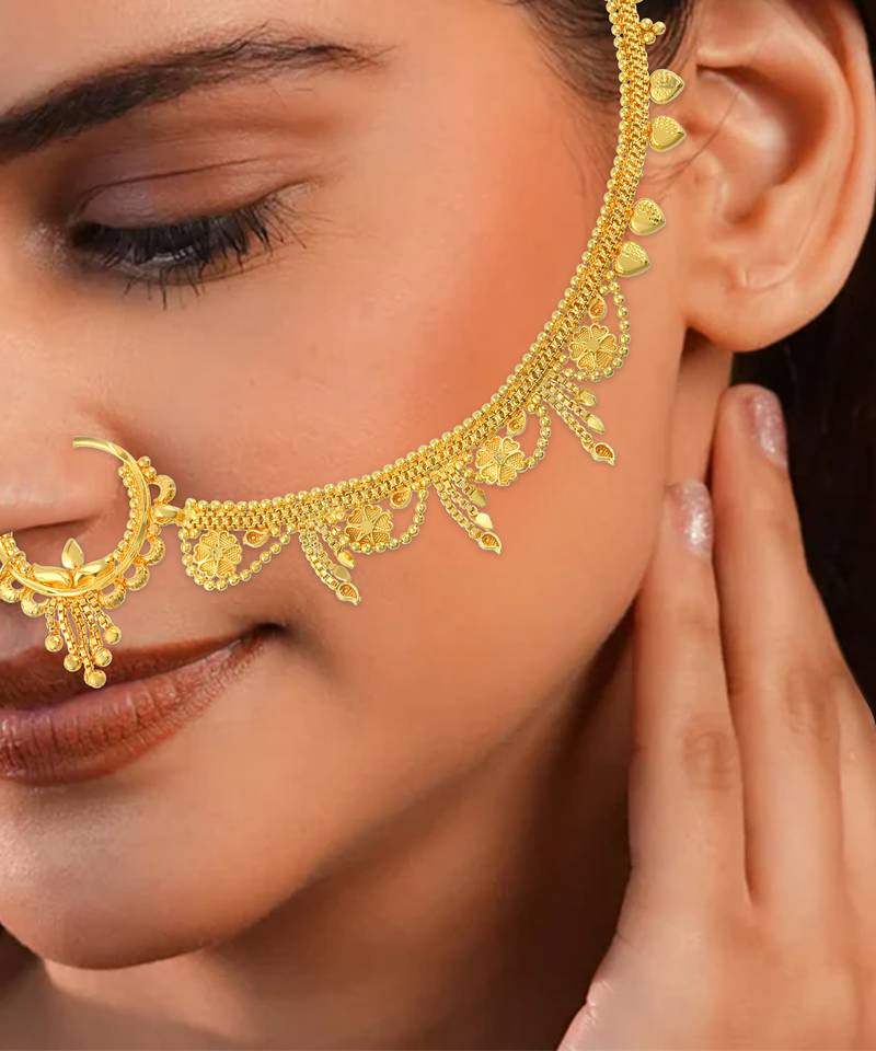 Product Description | Elevate Your Ethnic Ensemble With This Stunning Brass 24 Kt Micron Gold Plated Nathaniya Chain Nose Ring, A Timeless Piece Inspired By Traditional Indian Bridal Jewellery. Crafted With Precision And Adorned With Intricate Leaf Motifs, This Nath Seamlessly Blends Heritage With Elegance. The Delicate Chain Gracefully Connects The Nose Ring To The Ear, Creating A Captivating Silhouette That Enhances Your Facial Features. Whether You're The Bride, A Bridesmaid, Or Attending A Festive Celebration, This Nose Ring Adds A Touch Of Royal Charm To Your Look. Its Lightweight Construction Ensures Comfort, While The Rich Gold Plating Offers A Luxurious Finish That Stands Out. A Must Have Accessory For Every Woman Who Cherishes Tradition And Style. |