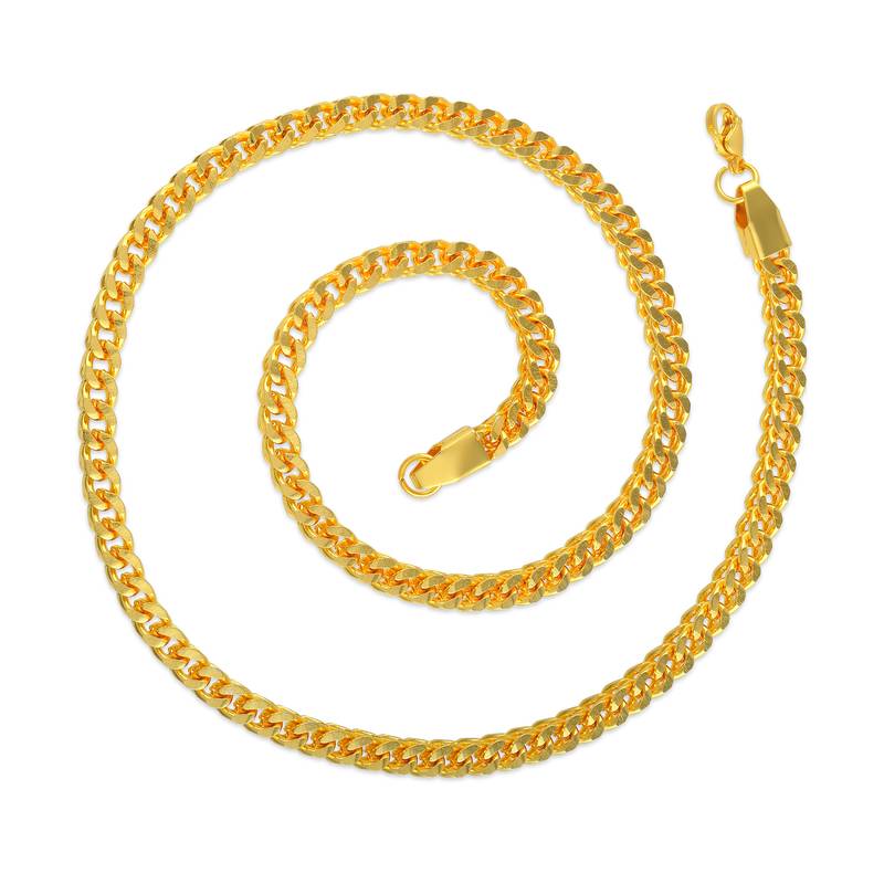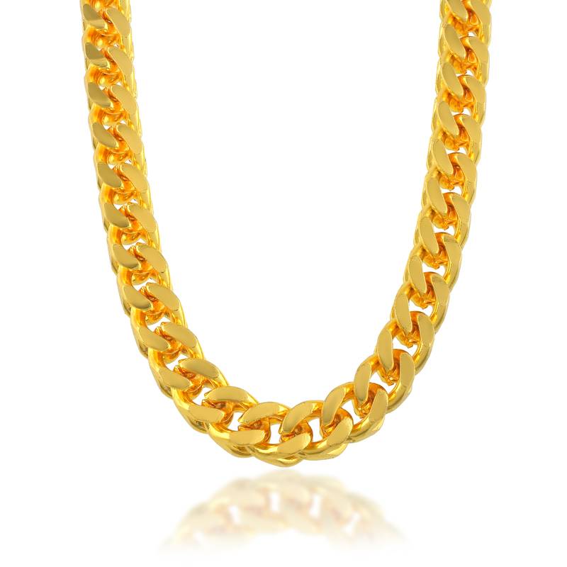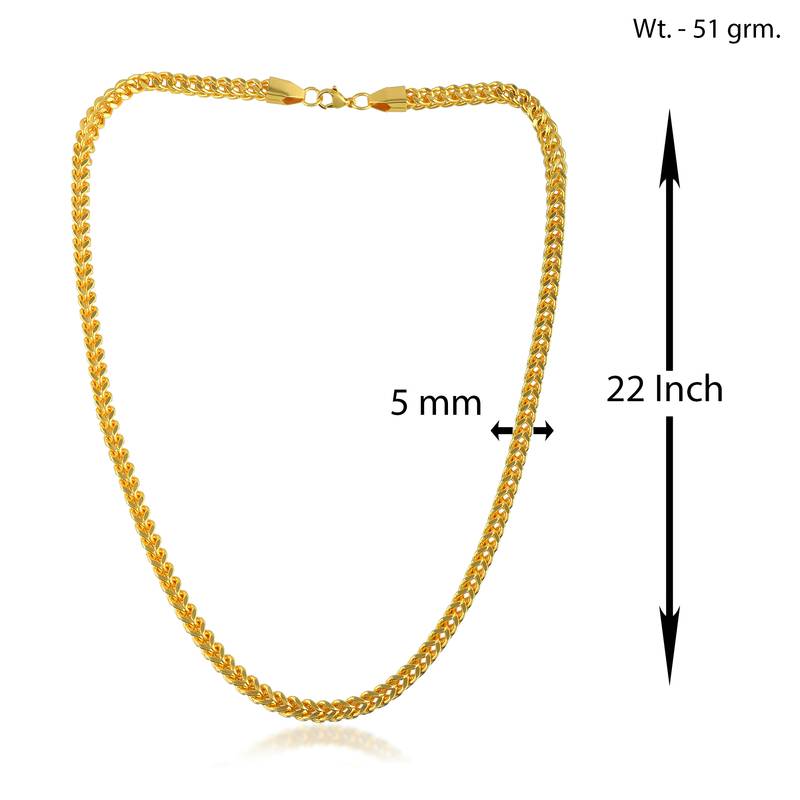 Make A Bold Statement With This Exquisite 24 Kt Gold Plated Chain Necklace. Crafted From Premium Skin Safe, Anti Allergy Brass With Genuine 1 Gram Gold Plate Forming, This Magnificent Piece Measures 22 Inches In Length 5mm In Breadth, And Weighs A Substantial 51 Grams. The Sturdy Cuban Link Design Showcases Intricate Texturing That Catches The Light Beautifully, Creating An Opulent Appearance Reminiscent Of Fine Gold Jewellery. Perfect For Special Occasions Like Weddings And Engagement Ceremonies, This Chain Adds A Touch Of Sophistication To Any Formal Ensemble. The Skin Safe Metal Composition Ensures Comfortable Wear, While The Robust Construction Promises Lasting Durability. Whether As A Self Indulgent Purchase Or A Thoughtful Gift For The Important Men In Your Life, This Necklace Delivers The Perfect Balance Of Style And Substance. The Secure Lobster Clasp Ensures The Chain Stays Firmly In Place Throughout Your Wear.