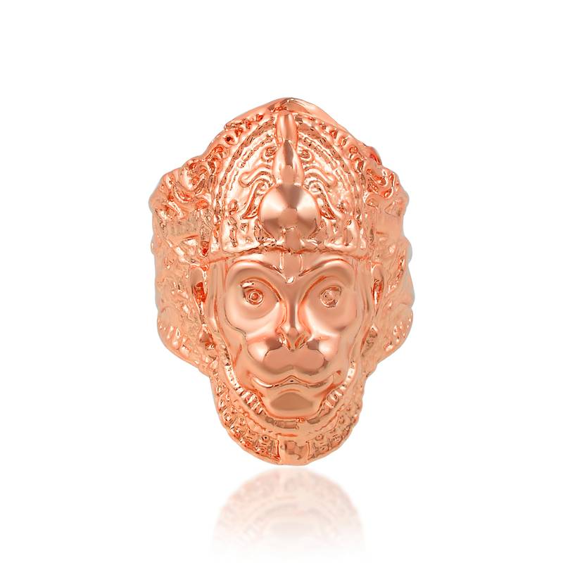 Product Description | This Rose Gold Ring Featuring A Lion Like Face Strongly Evokes Themes Of Strength, Courage, And Spirituality, Which Aligns With The Imagery Of Lord Hanuman/Bajrangbali/ Balaji Experience The Divine Power Of Bajrangbali Embrace The Powerful Energy Of Lord Hanuman, The Epitome Of Strength (Shakti), Courage (Sahas), And Selfless Devotion (Bhakti), With This Stunning Rose Gold Plated Hanuman Ring. This Intricately Sculpted Piece Is More Than Just A Ring—It Is A Spiritual Talisman, A Constant Reminder Of The Monkey God's Immense Power And Unwavering Protection. The Bold, Fierce Face Captures The Essence Of Hanuman Ji's Strength, Making It A Powerful Statement Accessory For The Modern Devotee. Key Features & Craftsmanship: Design Inspiration: Inspired By The Revered Deity Lord Hanuman (Also Known As Bajrangbali/ Balaji Or Anjaneya), This Ring Brings A Touch Of Divinity And Warrior Spirit To Your Everyday Wear. Lustrous Finish: Electroplated With A Rich Rose Gold Finish For A Warm, Opulent, And Trendy Look That Stands Out. Built To Last: Crafted From Robust Premium Jewellery Grade Copper Metal , This Ring Is Highly Durable, Non Corrosive, And Perfect For Daily Use. Versatile Style: Suitable For Traditional, Ethnic, Or Even Modern Fashion. It Serves As A Meaningful Piece Of Hindu God Jewelry And A Powerful Accessory. The Perfect Spiritual Gift: Gift This Meaningful Piece To A Loved One As A Symbol Of Your Wish For Their Strength, Success, And Protection. Ideal For All Ages On Religious Festivals, Anniversaries, Or Special Milestones. Care Instructions: Keep Away From Harsh Chemicals, Perfumes, And Water To Maintain The Rose Gold Plating's Brilliance. |