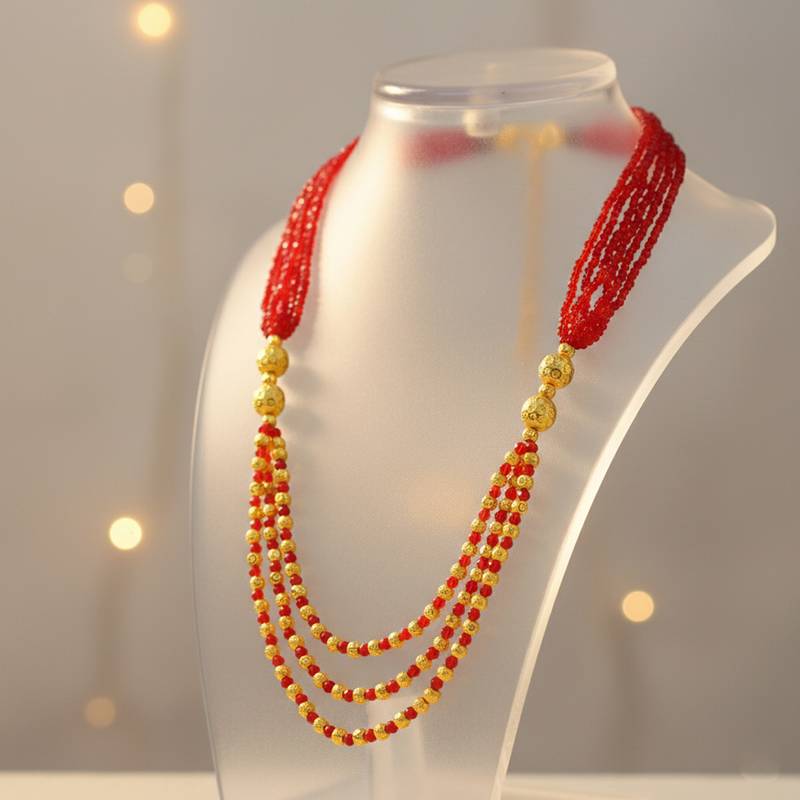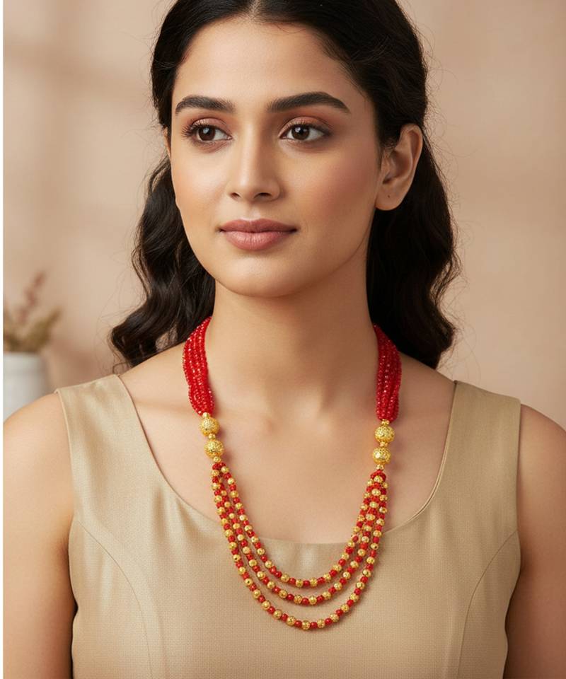 | Product Description | Elevate Your Bridal Or Festive Look With This Exquisite Multi Strand Faux Burma Ruby ( लैब क्रिएटेड रूबी हार माला ) Necklace. Crafted With Precision, The Necklace Features Lush Ruby Red Round Ball Beads Interwoven With Intricately Designed Brass Gold Plated Beads. The Centerpiece Showcases Three Thick Cascading Strands, Beautifully Suspended By Four Thin Emerald Beaded Strands, Creating A Regal Layered Effect. Perfect For Weddings, Receptions, And Traditional Occasions, This Necklace Blends Timeless Craftsmanship With A Luxurious Modern Appeal. Designed To Complement Ethnic Attire, It Adds A Touch Of Elegance And Grandeur To Every Ensemble. |