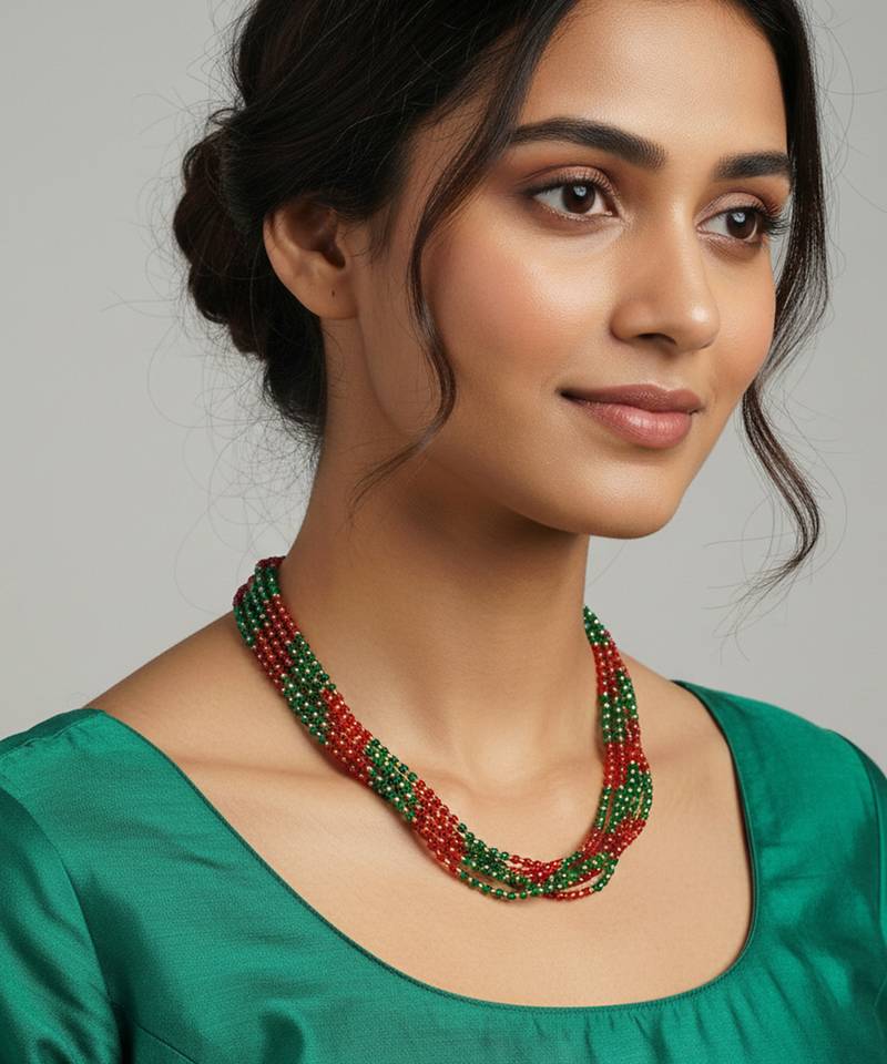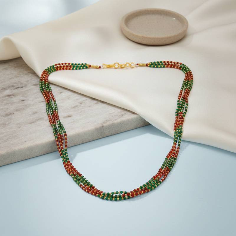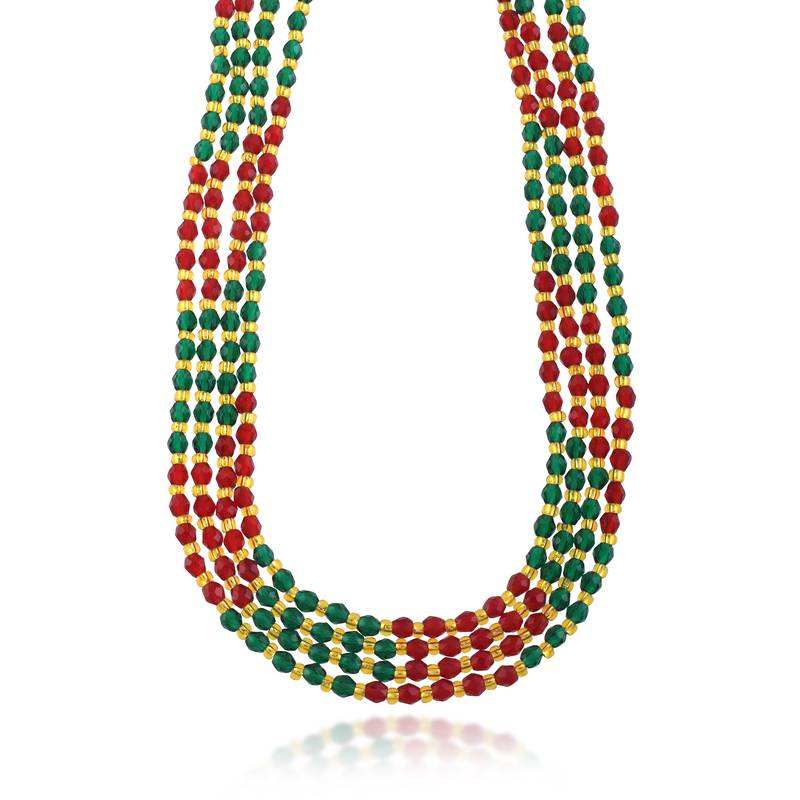 | Product Description | Elevate Your Ensemble With This Exquisite Four Strand Necklace, Meticulously Crafted To Blend Timeless Tradition With Modern Elegance. Studded With Shimmering Imitation Ruby And Emerald Stones, Each Strand Radiates Richness And Charm. Measuring 22 Inches In Length, This Layered Beauty Gracefully Drapes Around The Neckline, Making It A Perfect Choice For Weddings, Bridal Events, Festive Celebrations, Or Even Casual Outings. Designed For Comfort And Safety, This Necklace Is A Risk Free Ornament That Can Be Worn Confidently At All Times. Whether You're Dressing Up For A Grand Occasion Or Adding A Touch Of Grace To Your Everyday Look, This Piece Promises To Enhance Your Appeal With Its Vibrant Hues And Intricate Craftsmanship. |