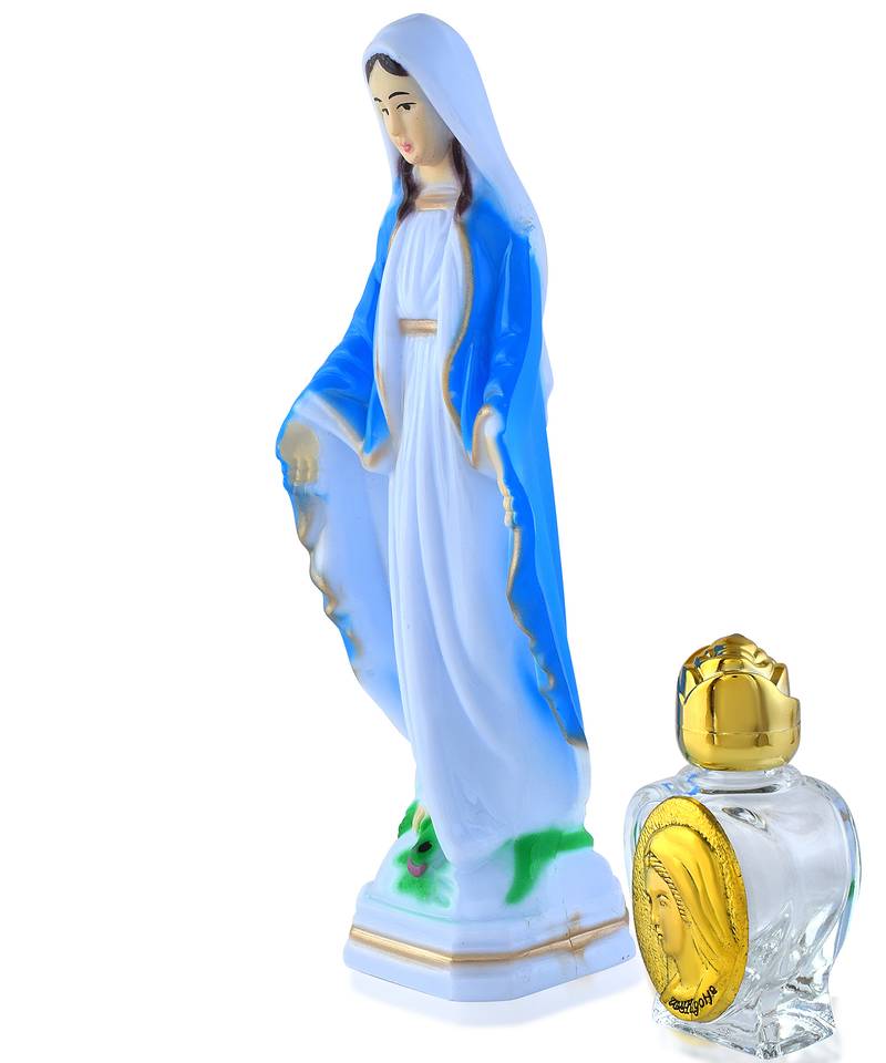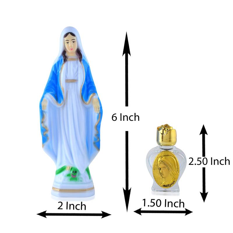 | Product Description | Bring Divine Grace And Serenity Into Your Home With This Exquisite Devotional Set Featuring A Beautifully Crafted Virgin Mary Statue And A Heart Shaped Crystal Holy Water Bottle. Inspired By The Sacred Apparitions Of Medjugorje, This Spiritual Duo Is Perfect For Prayer Corners, Altars, Or Gifting To Loved Ones. The Virgin Mary Figurine Stands In A Gentle Pose With Open Arms, Dressed In Flowing White Robes And A Serene Blue Mantle, While A Symbolic Serpent Rests At Her Feet. The Accompanying Bottle Is Adorned With A Golden Rose Shaped Cap And A Radiant Medallion Bearing The Profile Of The Virgin Mary. A Timeless Christian Decor Piece That Radiates Peace, Protection, And Faith. |