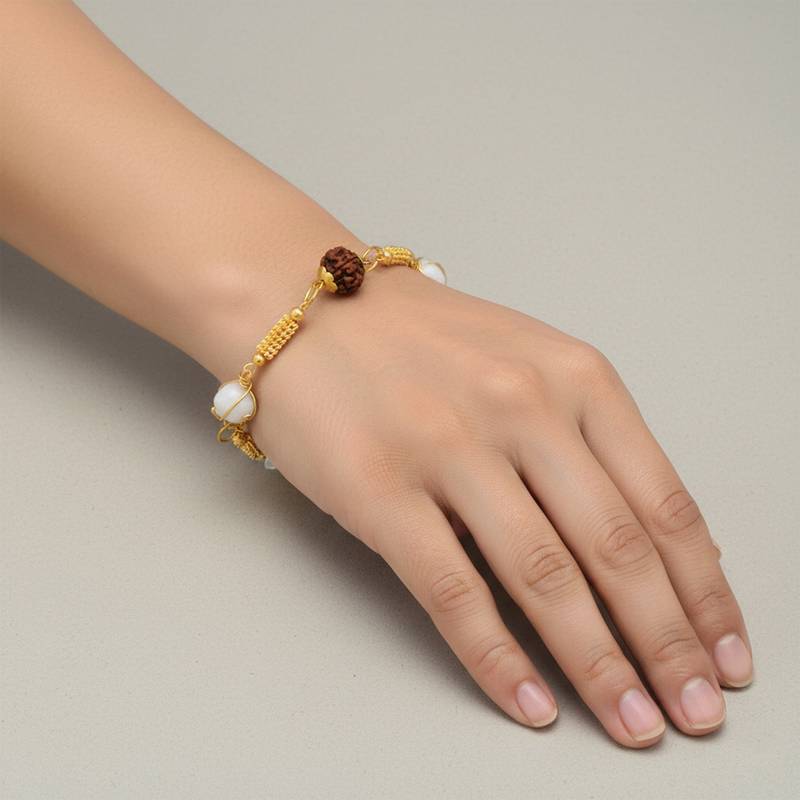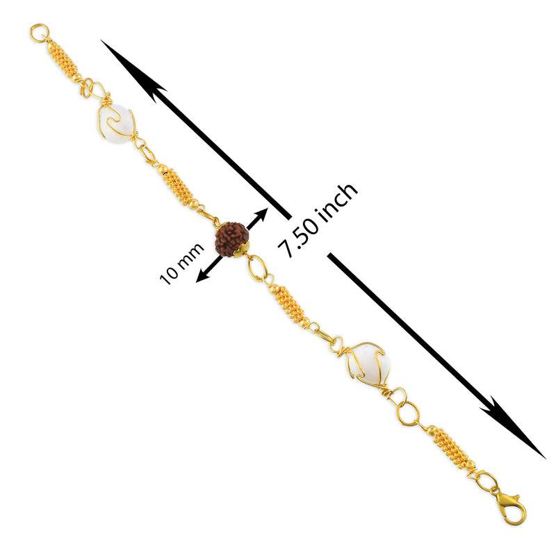 This Stylish Bracelet Is Crafted With Natural Panchmukhi Rudraksh, Macch Mani , And Brass Gold Plated Beads, Making It Perfect For Both Men And Women. More Than Just A Fashion Accessory, It Carries Deep Spiritual And Religious Significance. Associated With Lord Shiva, This Bracelet Brings Peace, Strength, And Positive Energy To The Wearer. The Powerful Combination Of Rudraksh And Macch Mani Balances The Body, Mind, And Soul. Ideal As Temple Jewellery, It Enhances Grace And Charm On Every Occasion. यह प्राकृतिक पंचमुखी रुद्राक्ष, मच्छ मणि और ब्रास गोल्ड प्लेटेड बीड्स से बना स्टाइलिश कंगन पुरुषों और महिलाओं दोनों के लिए उपयुक्त है। यह आभूषण न केवल फैशन का हिस्सा है बल्कि आध्यात्मिक ऊर्जा और धार्मिक महत्व भी प्रदान करता है। भगवान शिव से जुड़ा यह कंगन पहनने वाले को शांति, शक्ति और सकारात्मक ऊर्जा का अनुभव कराता है। रुद्राक्ष और मच्छ मणि का संयोजन शरीर, मन और आत्मा को संतुलित करता है। यह कंगन मंदिर ज्वेलरी के रूप में भी आदर्श है और हर अवसर पर आकर्षण और गरिमा बढ़ाता है।