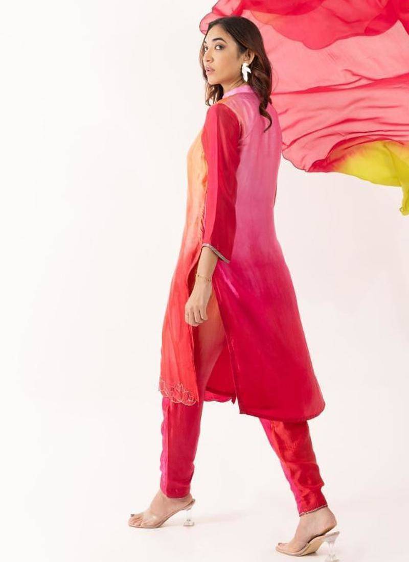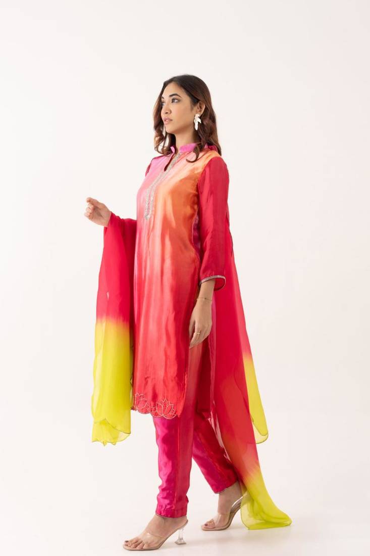 | Product Description | This Vibrant Ombre Kurta Set Blends Shades Of Pink, Orange, And Red With Intricate Lotus Embroidery At The Hem, Paired With A Sleek Straight Pant. The Outfit Exudes A Festive Charm, Perfect For Lively Celebrations Or Elegant Gatherings. |