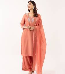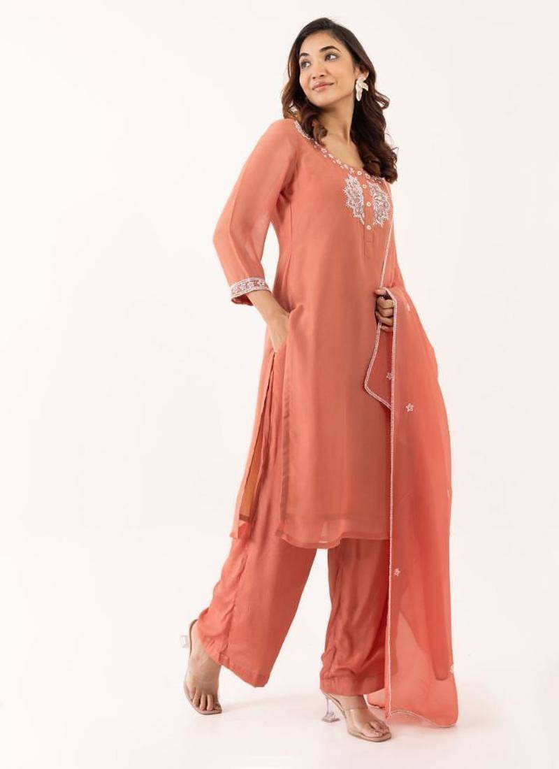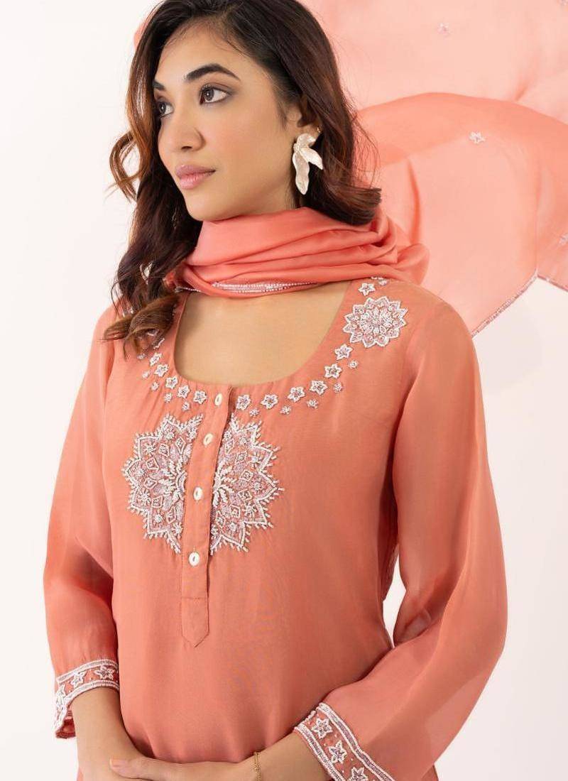 | Product Description | This Is A Peach Cotton Suit Set Adorned With Delicate White Thread Embroidery On The Neckline And Sleeves. It Features A Straight Kurta Paired With Relaxed Fit Pants For Effortless Elegance. A Lightweight Matching Dupatta With Embroidered Motifs Completes The Graceful Look. |
