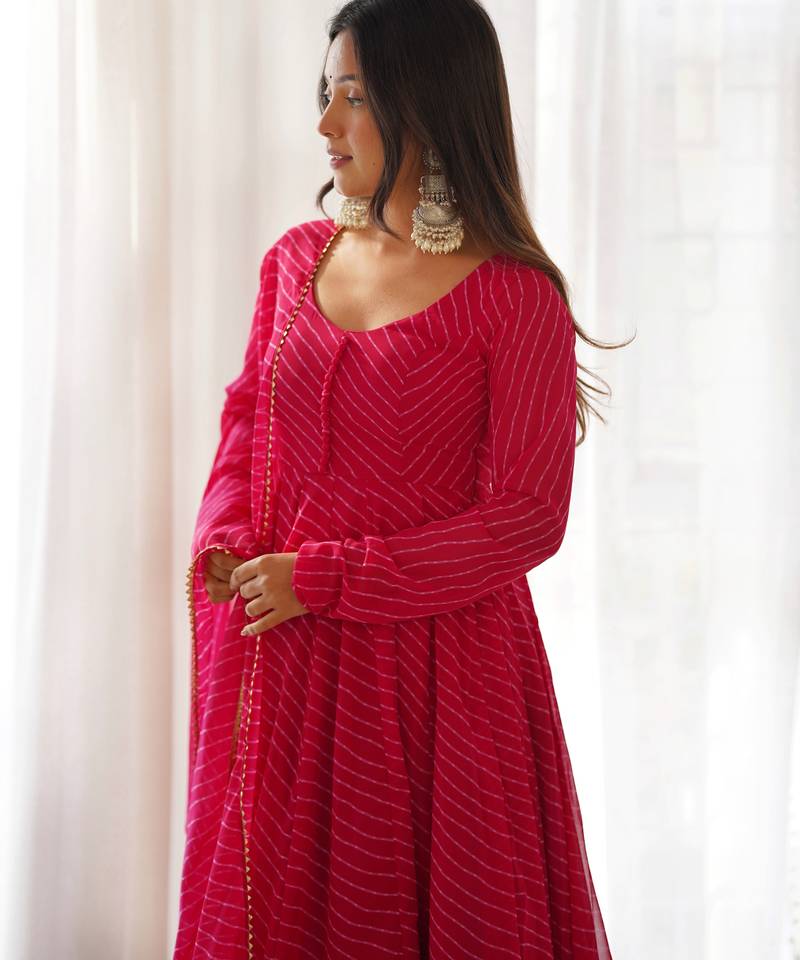 | Product Name | Rani Pink Color Laheriya Print Georgette Three Piece Anarkali Suit | |