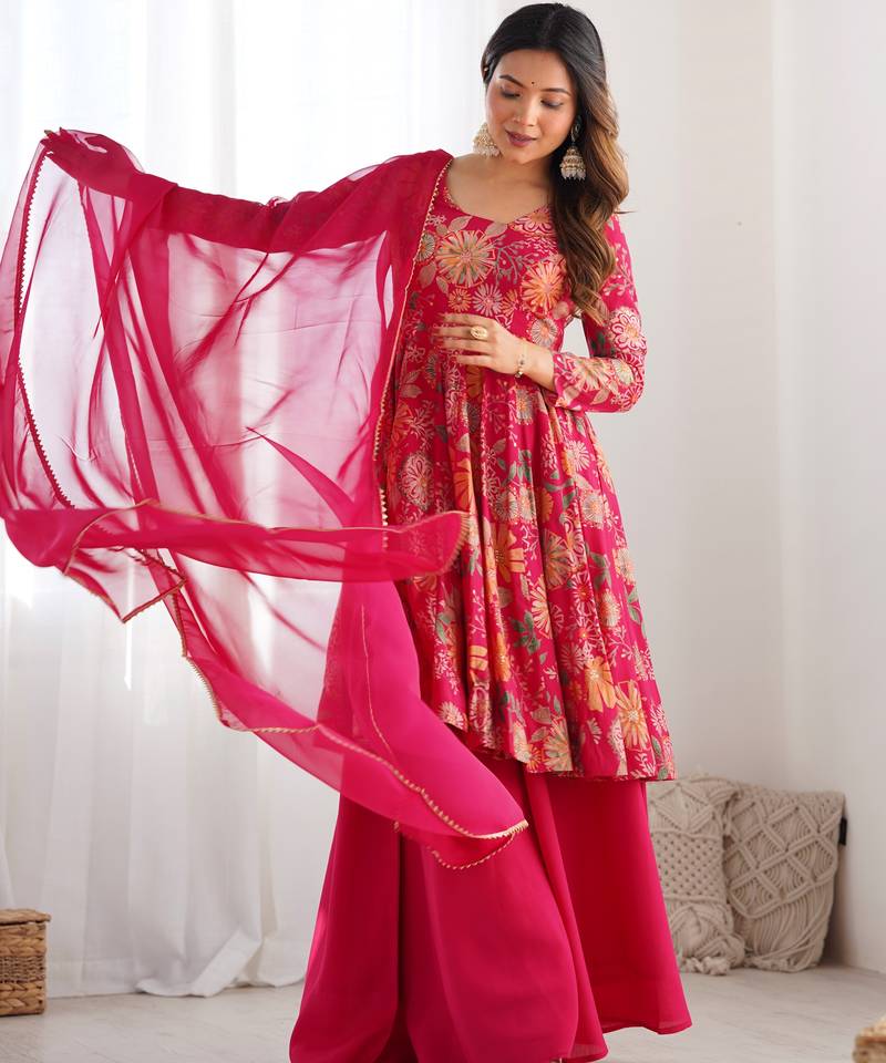Rani pink color roman silk discharge printed plazzo suit stitched