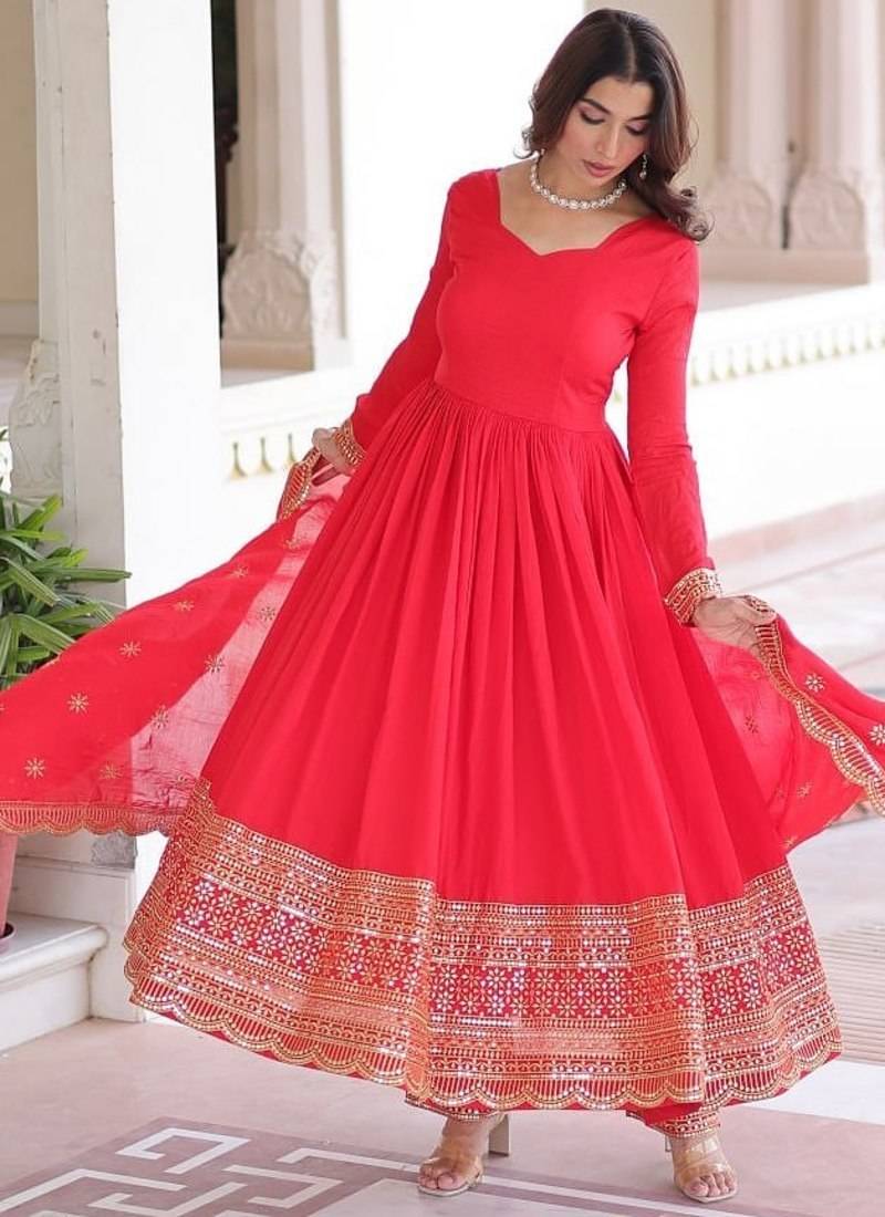 | Product Name | Red Vichitra Silk Embroidered Gown Set With Sequins Work, Dupatta & Bottom Full Sleeves, Fancy V Neck, 3 Meter Flair | |
