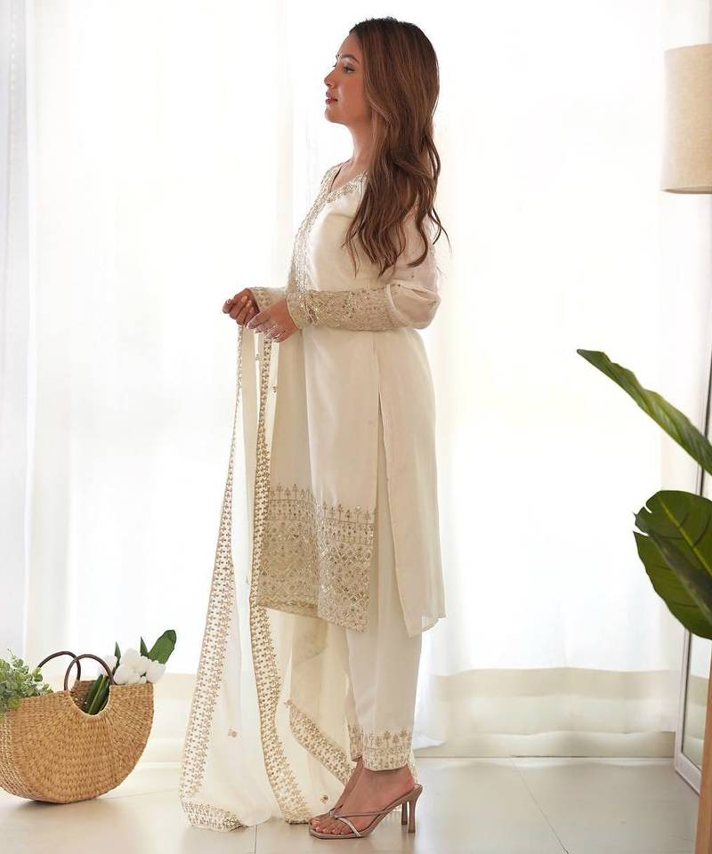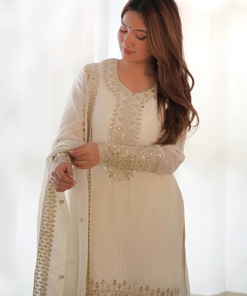 | Product Description | Elegant White Chinon Silk Three Piece Kurti Suit Featuring A Beautifully Crafted Kurti, Matching Bottoms, And A Graceful Dupatta. Perfect For Festive Occasions And Celebrations, Exuding Sophistication And Charm. |