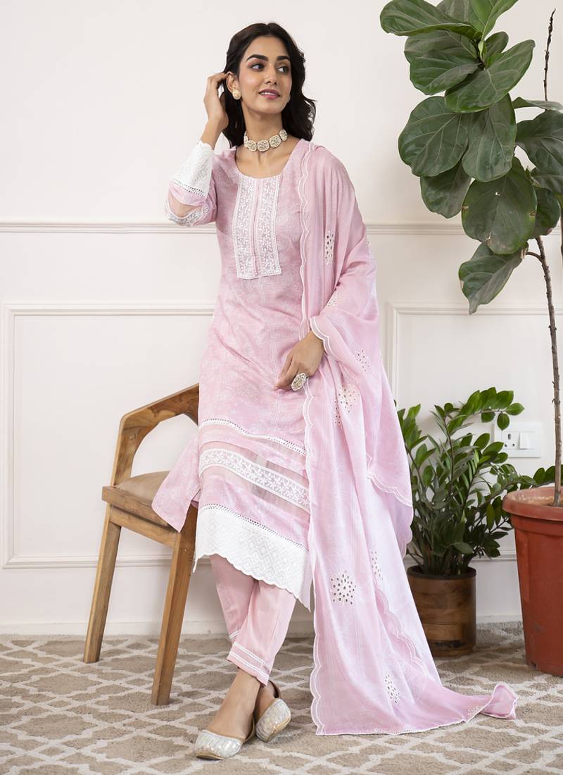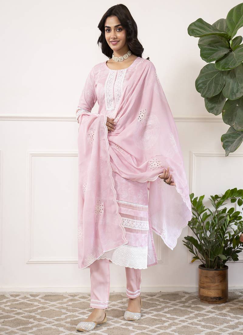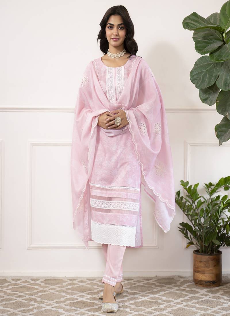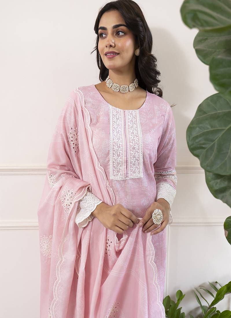 | Product Name | Pink White Women Floral Printed Thread Work Cotton Blend Straight Kurta With Trousers With Dupatta | |