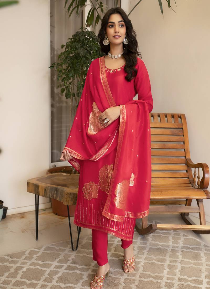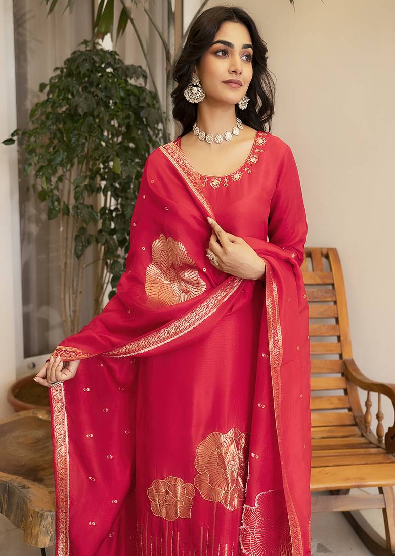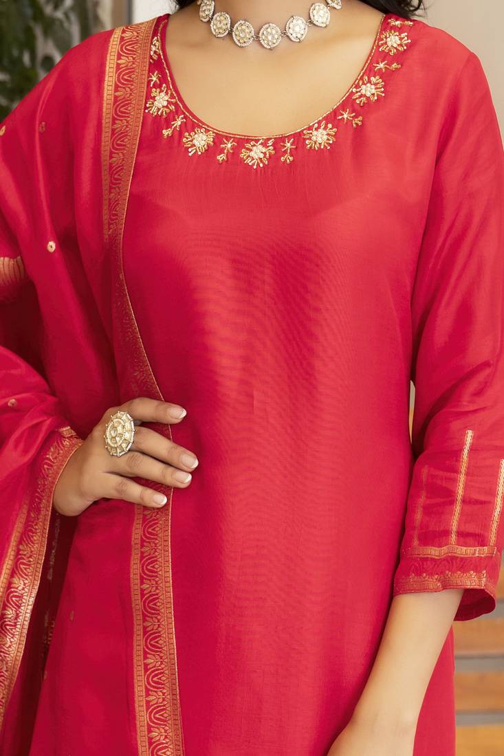 Viscose dola silk handworked straight kurta pant set with dupatta stitched