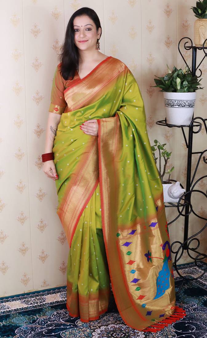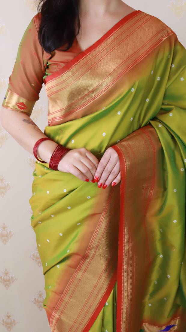 | Product Description | Elevate Your Ethnic Wardrobe With This Exquisite Bandhani Silk Saree, A Masterpiece Of Traditional Craftsmanship. The Soft Silk Body Features Intricate Bandhani Zari Woven Motifs Throughout, Creating A Mesmerizing All Over Pattern That Catches Light Beautifully. The Showstopper Is The Rich Paithani Meenakari Pallu, Adorned With Elaborate Woven Designs That Showcase Centuries Old Artistry. Complemented By A Simple Paithani Contrast Border That Frames The Drape Elegantly, This Saree Pairs Seamlessly With The Included Plain Contrast Blouse. Perfect For Festive Occasions, Weddings, And Celebrations Where Refined Sophistication Meets Traditional Heritage. |