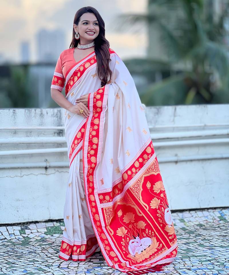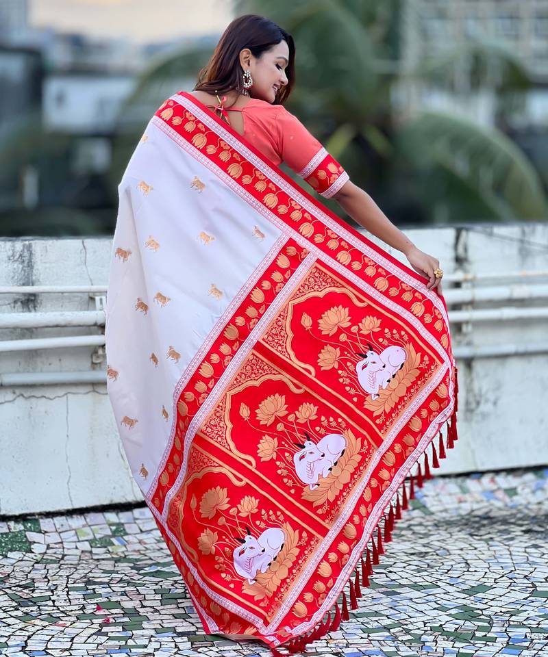 Product Description | This Soft Silk Pichwai Traditional Zari Woven Saree Features Delicate Cow Nandi Motifs Spread Across Its Body, Enhancing Its Cultural Richness. Its Contrast Satin Lotus Border Adds Refined Elegance, While The Rich Woven Nandi Cow Lotus Pichwai Pallu Serves As A Striking Focal Point. Completed With A Matching Brocade Blouse, This Saree Exemplifies Expert Craftsmanship And Traditional Artistry, Perfect For Occasions That Celebrate Heritage With Sophistication. |