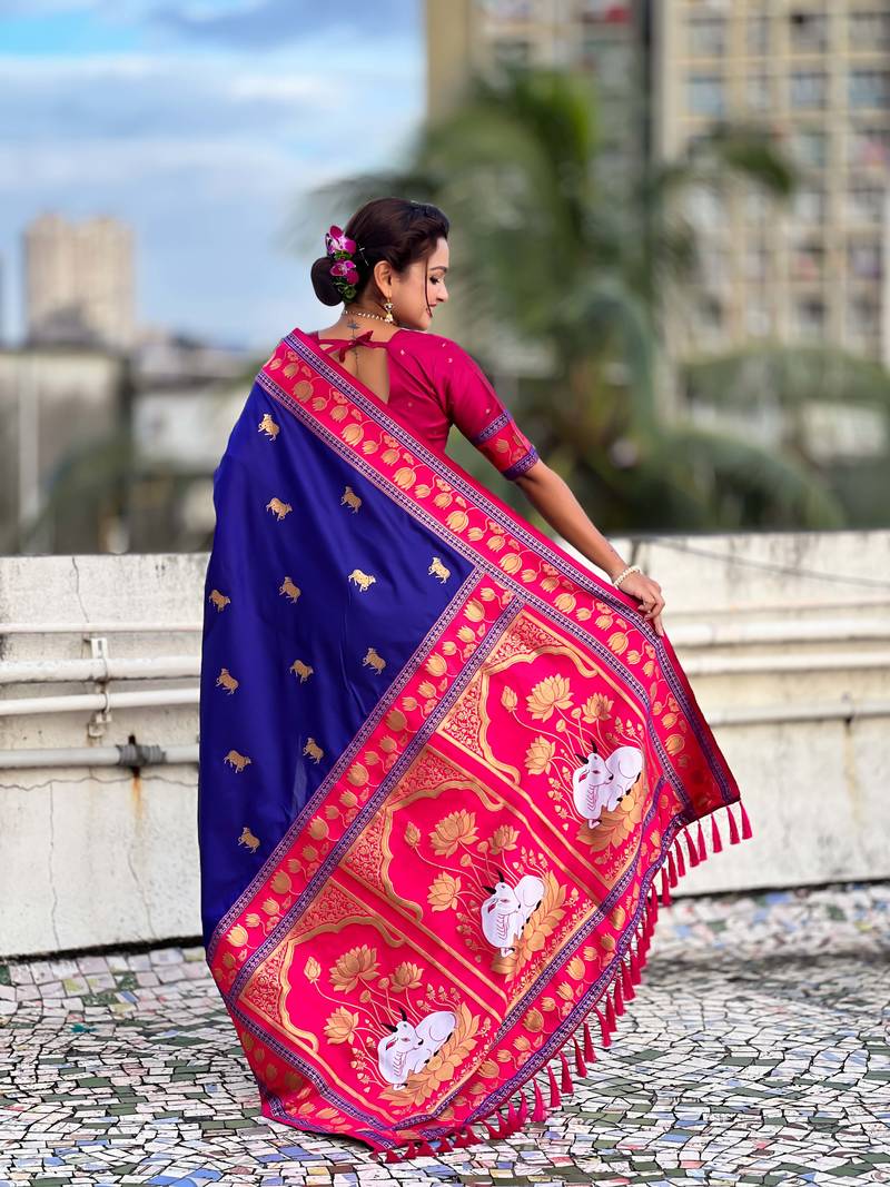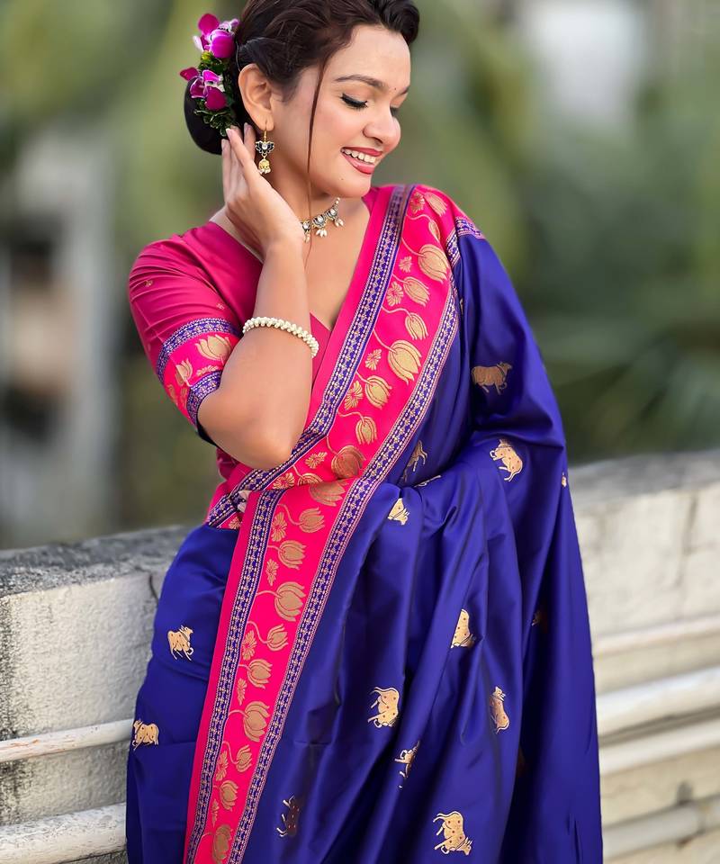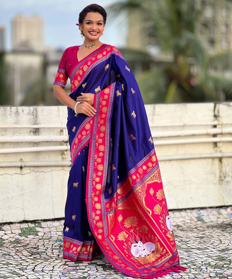 Product Description | This Soft Silk Pichwai Traditional Zari Woven Saree Features Delicate Cow Nandi Motifs Spread Across Its Body, Enhancing Its Cultural Richness. Its Contrast Satin Lotus Border Adds Refined Elegance, While The Rich Woven Nandi Cow Lotus Pichwai Pallu Serves As A Striking Focal Point. Completed With A Matching Brocade Blouse, This Saree Exemplifies Expert Craftsmanship And Traditional Artistry, Perfect For Occasions That Celebrate Heritage With Sophistication. |