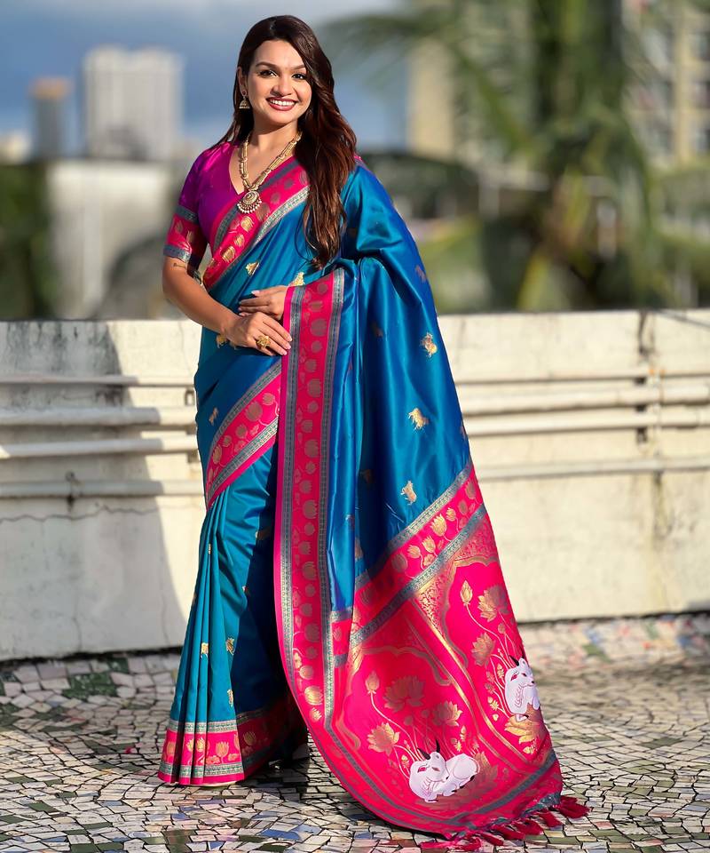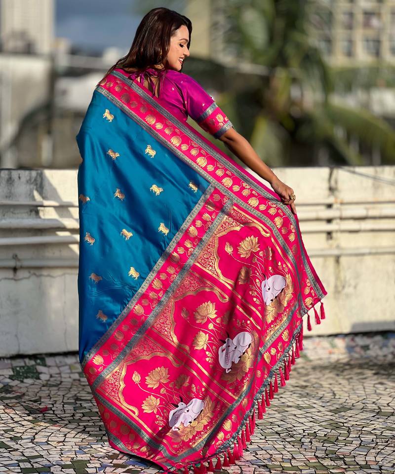 Product Description | This Soft Silk Pichwai Traditional Zari Woven Saree Features Delicate Cow Nandi Motifs Spread Across Its Body, Enhancing Its Cultural Richness. Its Contrast Satin Lotus Border Adds Refined Elegance, While The Rich Woven Nandi Cow Lotus Pichwai Pallu Serves As A Striking Focal Point. Completed With A Matching Brocade Blouse, This Saree Exemplifies Expert Craftsmanship And Traditional Artistry, Perfect For Occasions That Celebrate Heritage With Sophistication. |