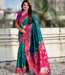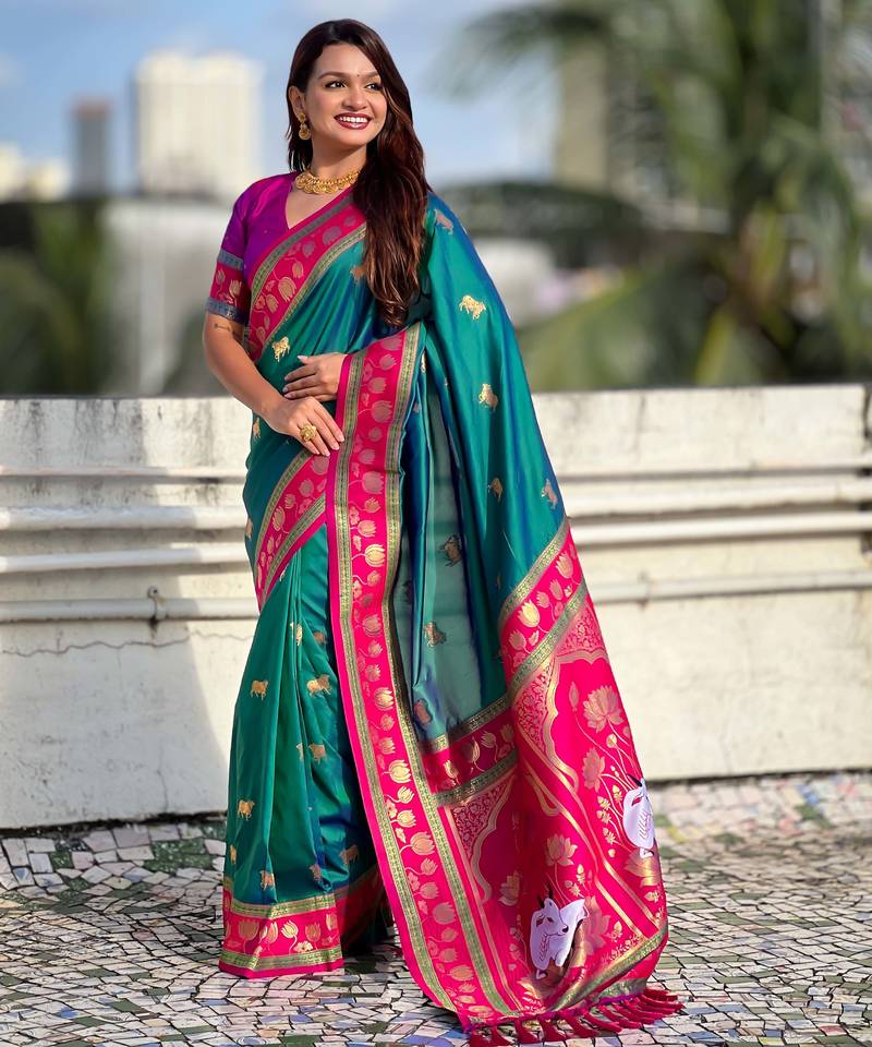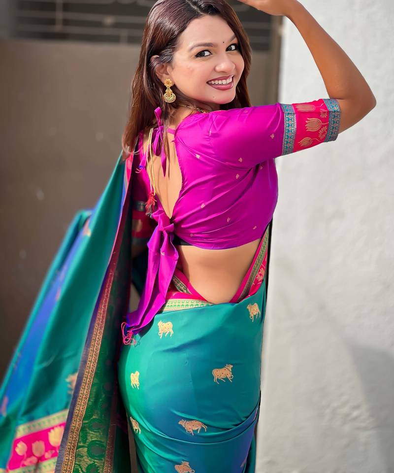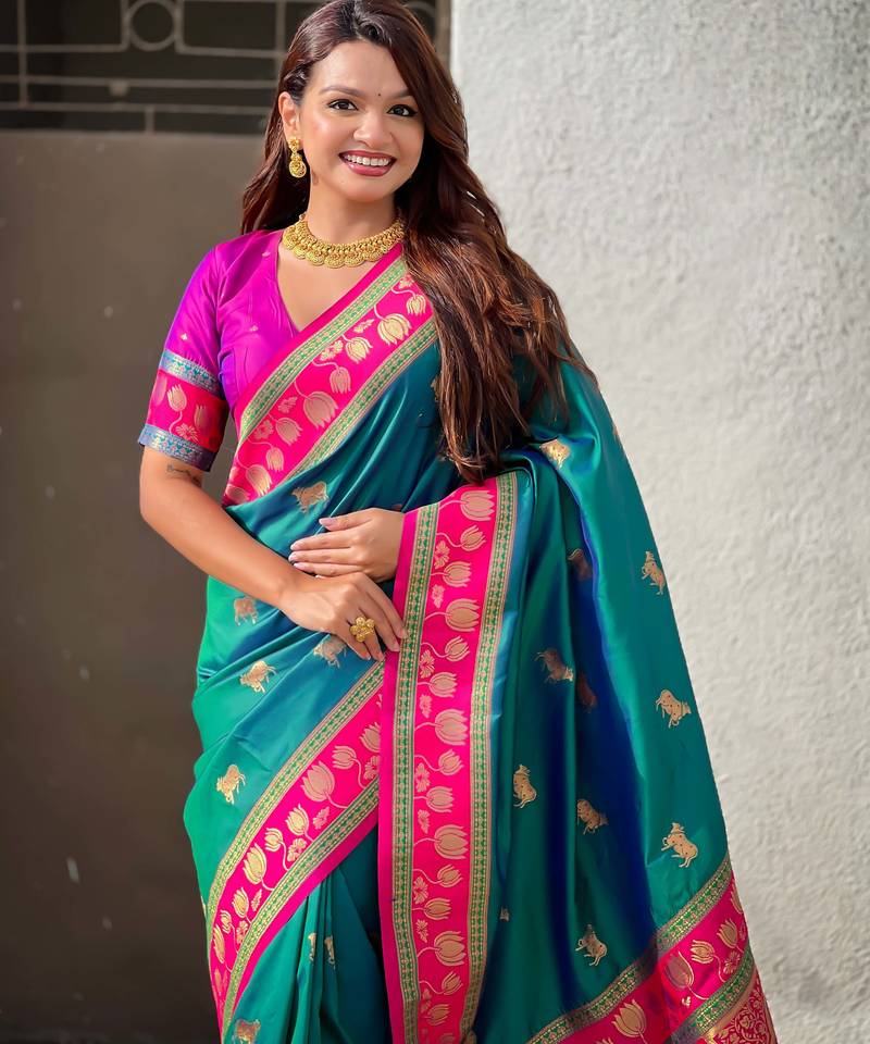 This Soft Silk Pichwai Traditional Zari Woven Saree Features Delicate Cow Nandi Motifs Spread Across Its Body, Enhancing Its Cultural Richness. Its Contrast Satin Lotus Border Adds Refined Elegance, While The Rich Woven Nandi Cow Lotus Pichwai Pallu Serves As A Striking Focal Point. Completed With A Matching Brocade Blouse, This Saree Exemplifies Expert Craftsmanship And Traditional Artistry, Perfect For Occasions That Celebrate Heritage With Sophistication.