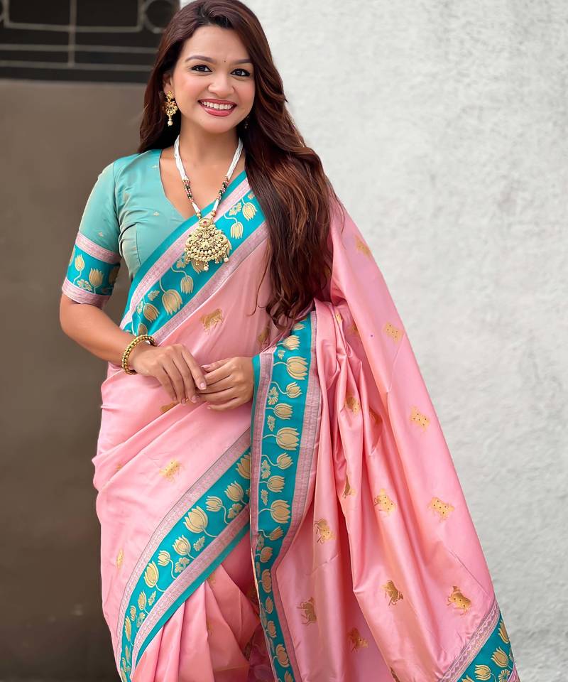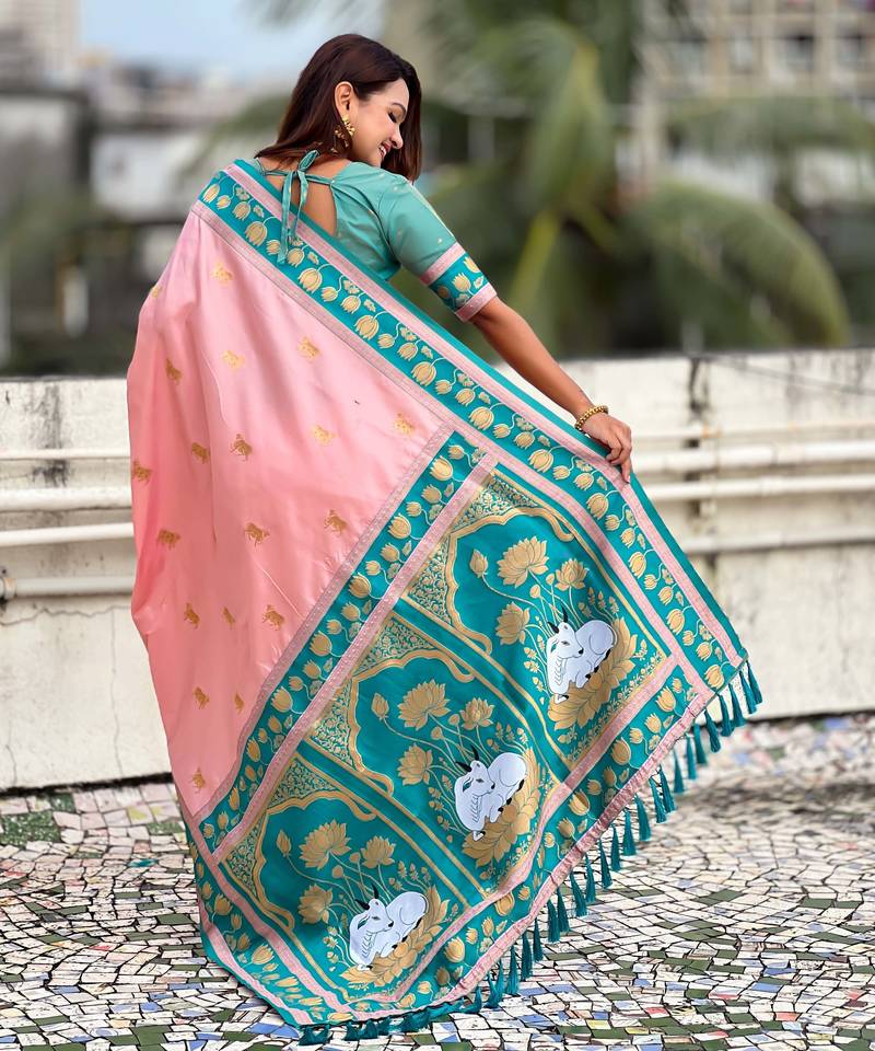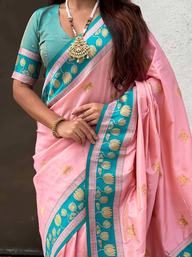 Product Description | This Soft Silk Pichwai Traditional Zari Woven Saree Features Delicate Cow Nandi Motifs Spread Across Its Body, Enhancing Its Cultural Richness. Its Contrast Satin Lotus Border Adds Refined Elegance, While The Rich Woven Nandi Cow Lotus Pichwai Pallu Serves As A Striking Focal Point. Completed With A Matching Brocade Blouse, This Saree Exemplifies Expert Craftsmanship And Traditional Artistry, Perfect For Occasions That Celebrate Heritage With Sophistication. |