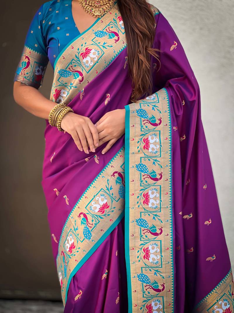 | Product Description | Discover The Timeless Elegance Of This Soft Silk Swan Rajhans Paithani Saree, A Masterpiece Of Traditional Indian Weaving. Adorned With Intricate Gold Zari Meenakari Peacock Motifs Throughout The Body, This Saree Showcases The Finest Craftsmanship. The Standout Feature Is The Richly Woven Swan Meenakari Paithani Pallu, Complemented By An Exquisite Meenakari Swan Fancy Border That Adds Distinctive Character. The Contrast Brocade Blouse, Perfectly Coordinated With The Saree's Design, Completes This Sophisticated Ensemble. Each Element Reflects Authentic Paithani Artistry, Making This Saree An Ideal Choice For Special Occasions And Celebrations Where Refined Taste Meets Cultural Heritage. |