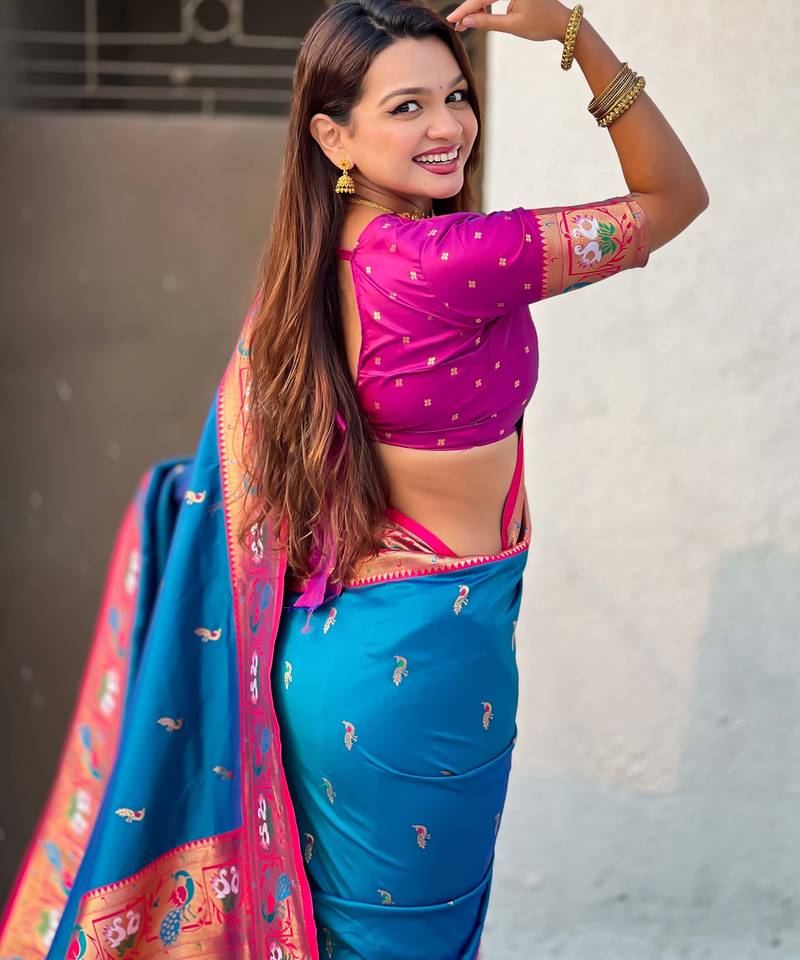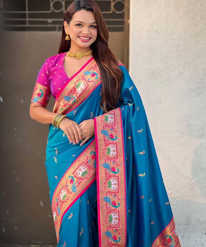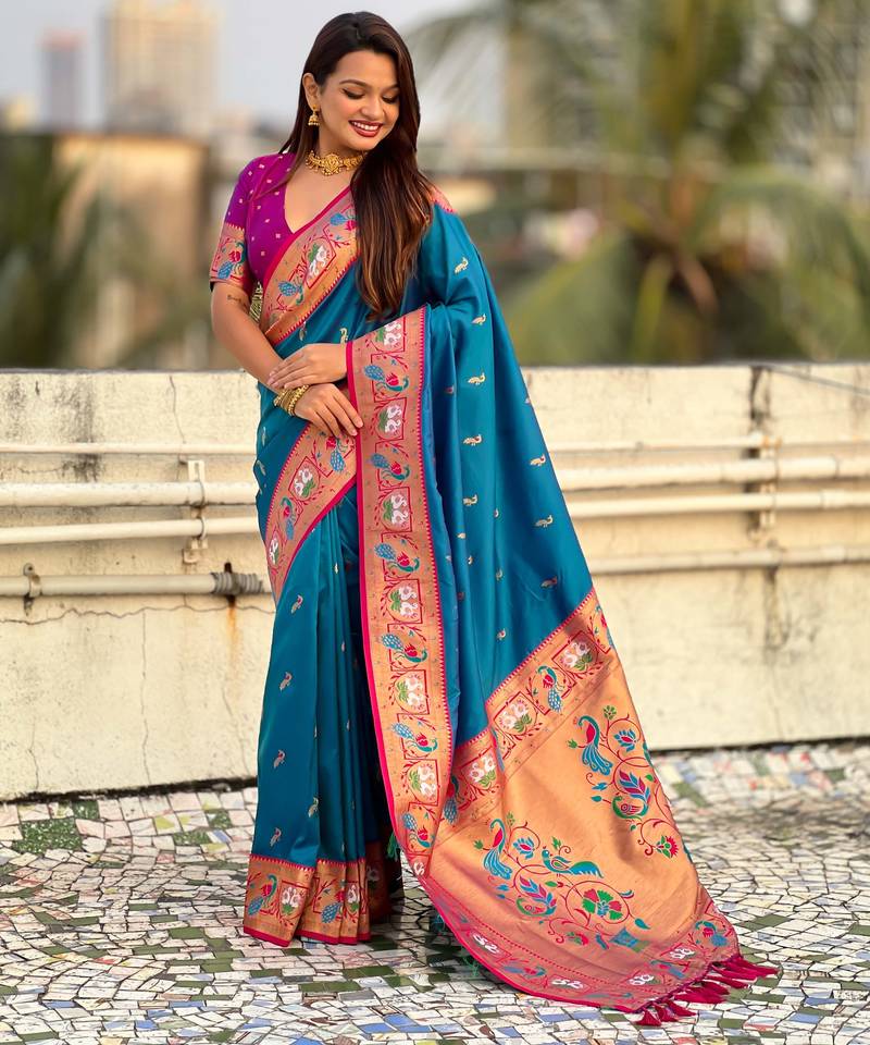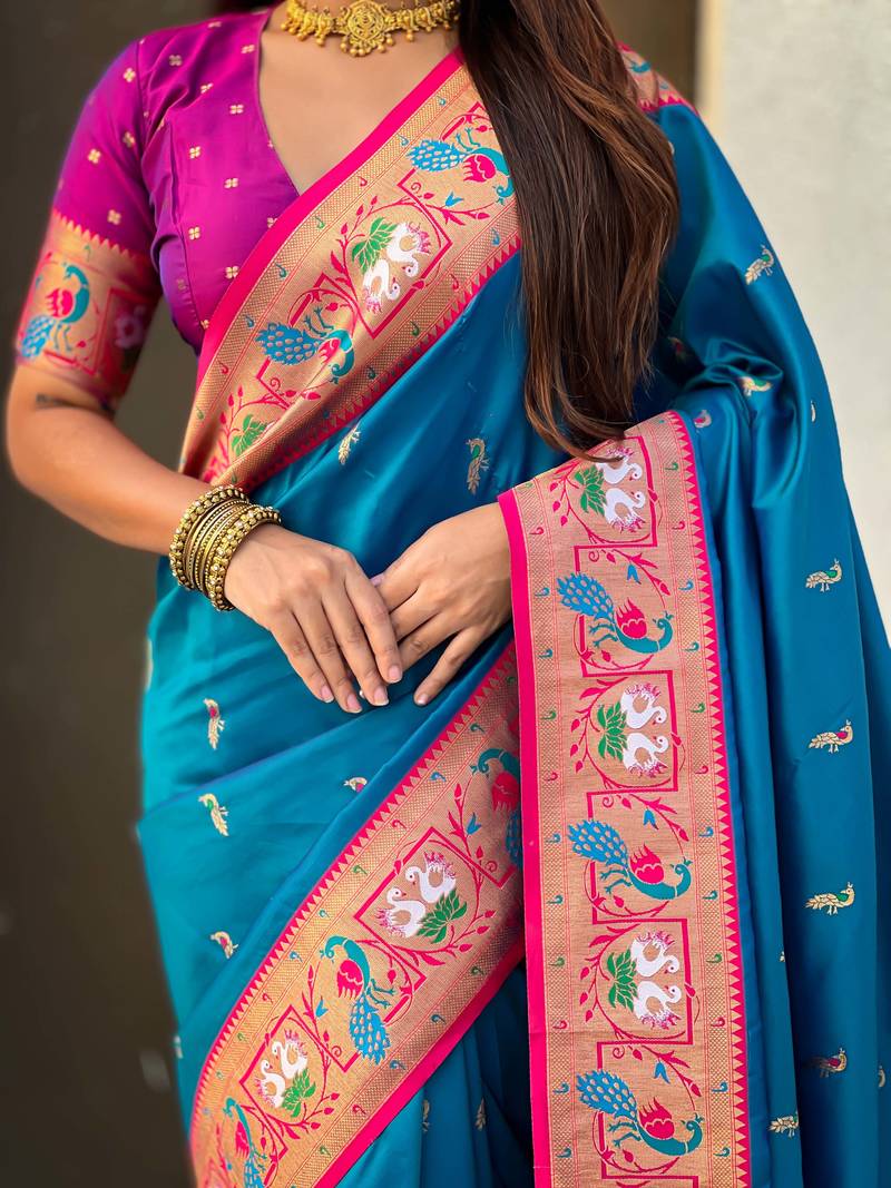 | Product Description | Discover The Timeless Elegance Of This Soft Silk Swan Rajhans Paithani Saree, A Masterpiece Of Traditional Indian Weaving. Adorned With Intricate Gold Zari Meenakari Peacock Motifs Throughout The Body, This Saree Showcases The Finest Craftsmanship. The Standout Feature Is The Richly Woven Swan Meenakari Paithani Pallu, Complemented By An Exquisite Meenakari Swan Fancy Border That Adds Distinctive Character. The Contrast Brocade Blouse, Perfectly Coordinated With The Saree's Design, Completes This Sophisticated Ensemble. Each Element Reflects Authentic Paithani Artistry, Making This Saree An Ideal Choice For Special Occasions And Celebrations Where Refined Taste Meets Cultural Heritage. |