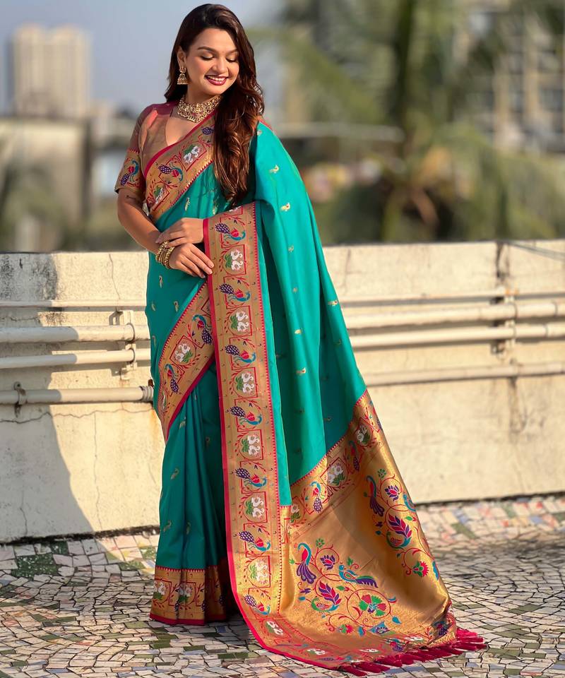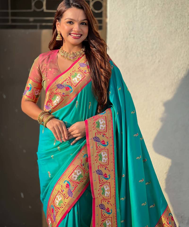 | Product Description | Discover The Timeless Elegance Of This Soft Silk Swan Rajhans Paithani Saree, A Masterpiece Of Traditional Indian Weaving. Adorned With Intricate Gold Zari Meenakari Peacock Motifs Throughout The Body, This Saree Showcases The Finest Craftsmanship. The Standout Feature Is The Richly Woven Swan Meenakari Paithani Pallu, Complemented By An Exquisite Meenakari Swan Fancy Border That Adds Distinctive Character. The Contrast Brocade Blouse, Perfectly Coordinated With The Saree's Design, Completes This Sophisticated Ensemble. Each Element Reflects Authentic Paithani Artistry, Making This Saree An Ideal Choice For Special Occasions And Celebrations Where Refined Taste Meets Cultural Heritage. |