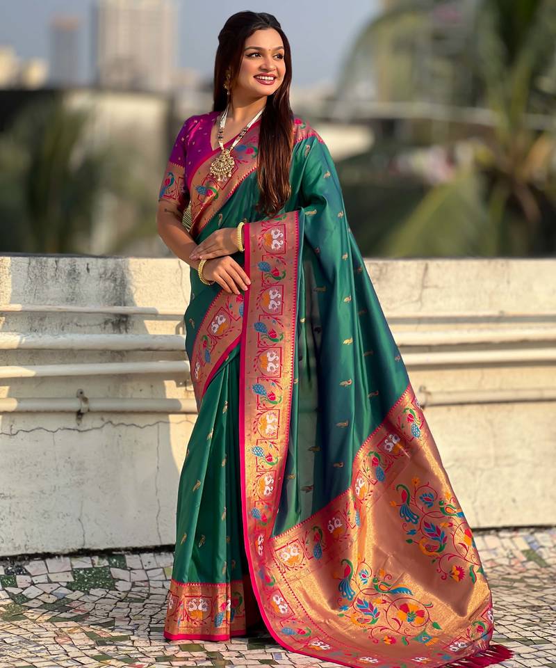 | Product Description | Discover The Timeless Elegance Of This Soft Silk Swan Rajhans Paithani Saree, A Masterpiece Of Traditional Indian Weaving. Adorned With Intricate Gold Zari Meenakari Peacock Motifs Throughout The Body, This Saree Showcases The Finest Craftsmanship. The Standout Feature Is The Richly Woven Swan Meenakari Paithani Pallu, Complemented By An Exquisite Meenakari Swan Fancy Border That Adds Distinctive Character. The Contrast Brocade Blouse, Perfectly Coordinated With The Saree's Design, Completes This Sophisticated Ensemble. Each Element Reflects Authentic Paithani Artistry, Making This Saree An Ideal Choice For Special Occasions And Celebrations Where Refined Taste Meets Cultural Heritage. |