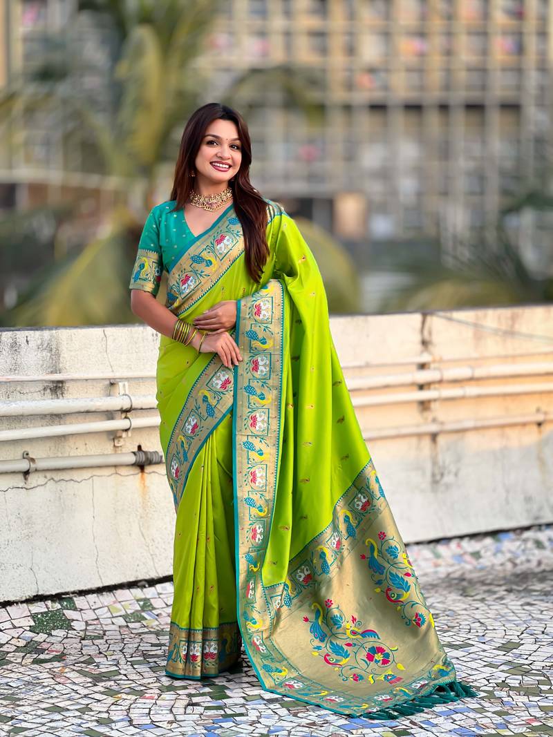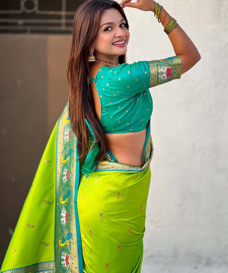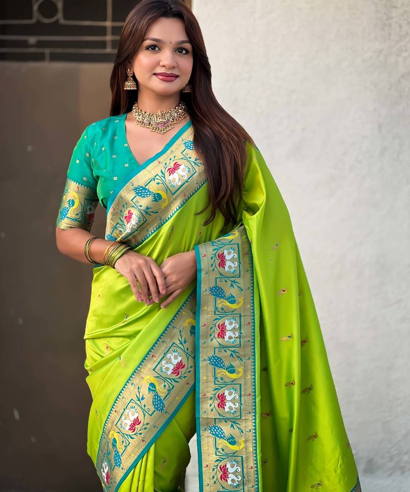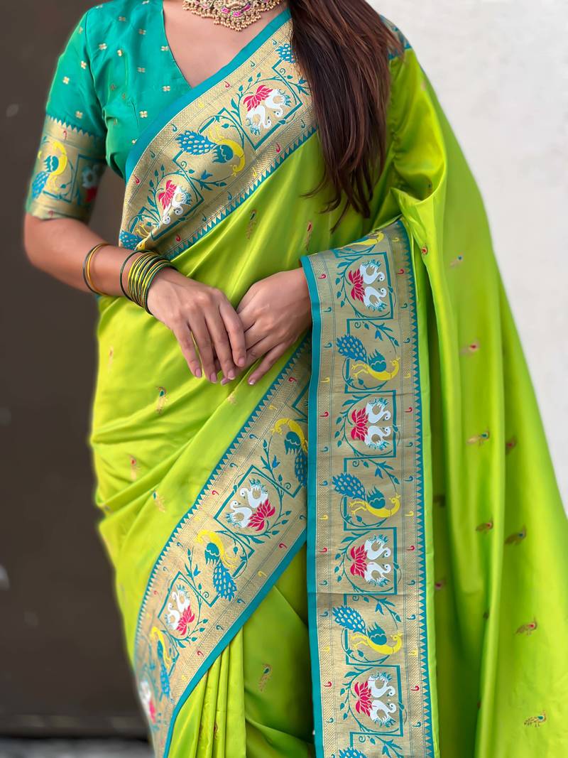 | Product Description | Discover The Timeless Elegance Of This Soft Silk Swan Rajhans Paithani Saree, A Masterpiece Of Traditional Indian Weaving. Adorned With Intricate Gold Zari Meenakari Peacock Motifs Throughout The Body, This Saree Showcases The Finest Craftsmanship. The Standout Feature Is The Richly Woven Swan Meenakari Paithani Pallu, Complemented By An Exquisite Meenakari Swan Fancy Border That Adds Distinctive Character. The Contrast Brocade Blouse, Perfectly Coordinated With The Saree's Design, Completes This Sophisticated Ensemble. Each Element Reflects Authentic Paithani Artistry, Making This Saree An Ideal Choice For Special Occasions And Celebrations Where Refined Taste Meets Cultural Heritage. |